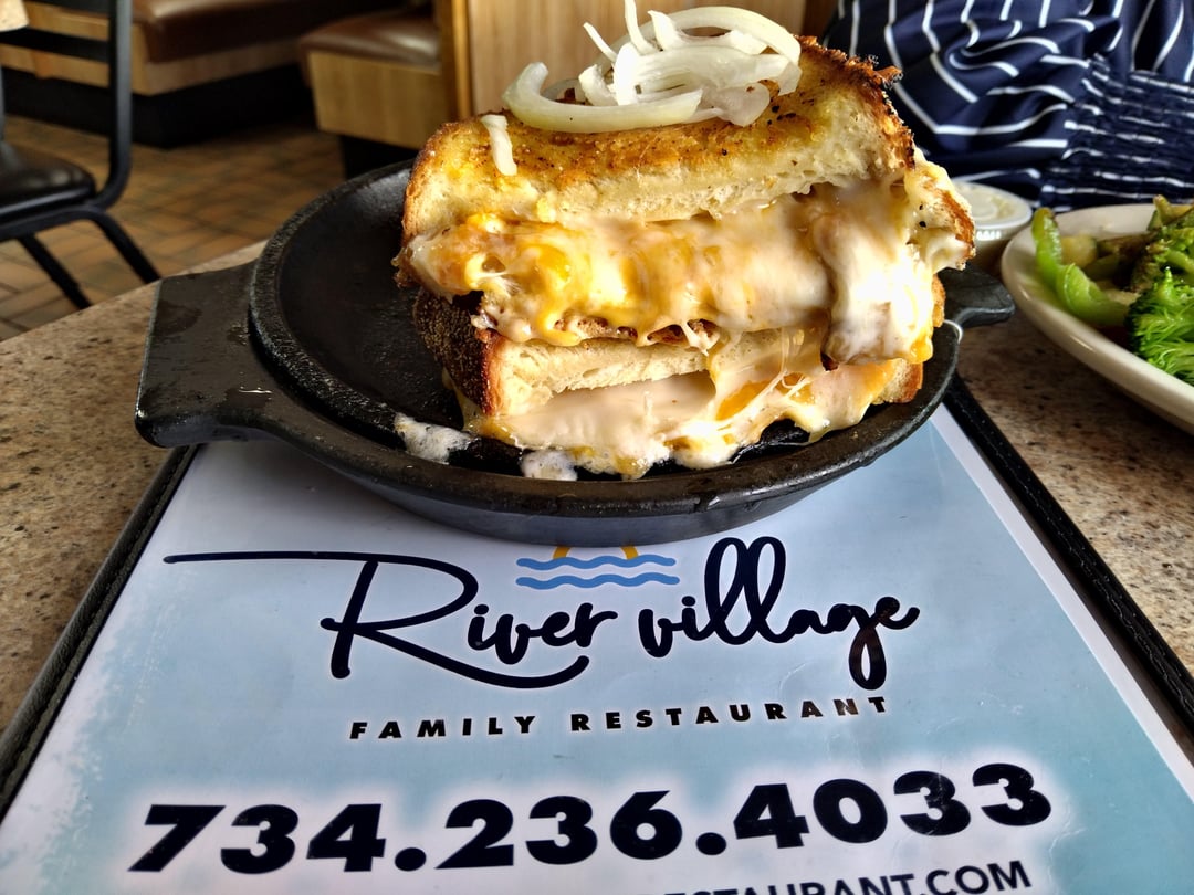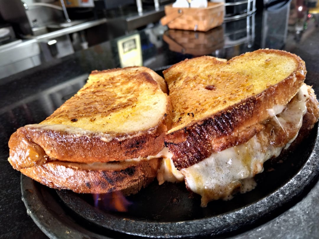 Day 3 of Sandwich Week 2024 the very best Grilled Cheese Supremo OMG. Challah Of A Grilled Cheese Garlic Parmesan encrusted challah bread grilled and filled with melted American, Swiss, mozzarella, and Cheddar cheese. Added Saganaki Cheese and lit on Fire with Brandy WOWED 😋 💯. Thanks Rageh