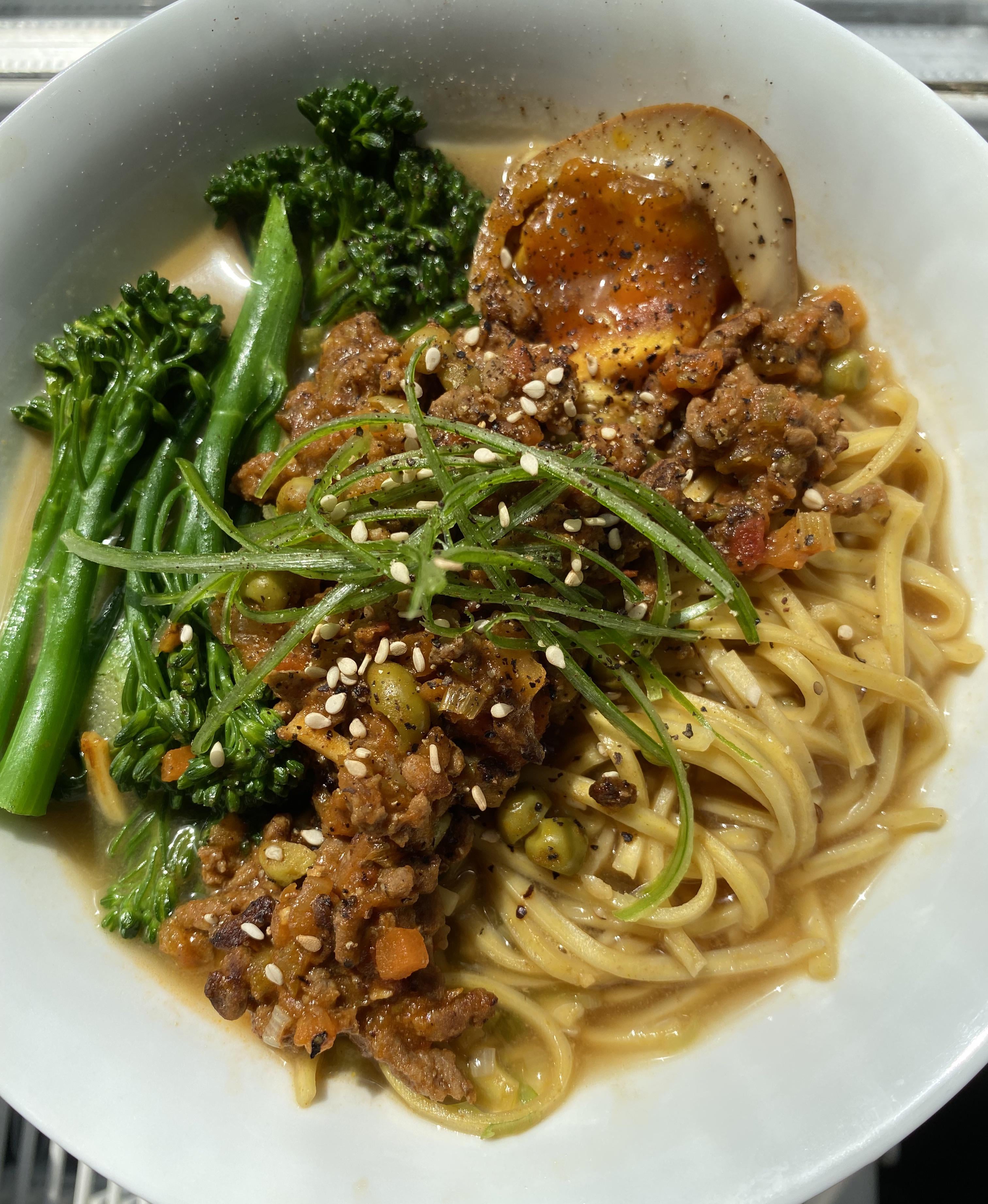 Shepherd’s pie filling, repurposed for dan dan noodles, topped with ramen egg