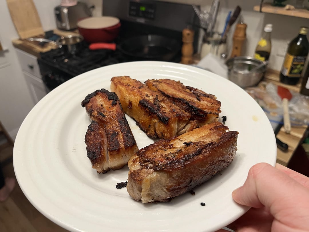 For the pork belly I followed Hugh Acheson’s recipe (soy sauce, fish sauce, and garlic) and did 171F for 12 hours (ended up being more like 14 hours), a 10 hour rest in the fridge, then pan sear to crispy on all sides. The flavor wasn’t much to speak of, but more importantly I thought the meaty part of the belly was somewhat tough.