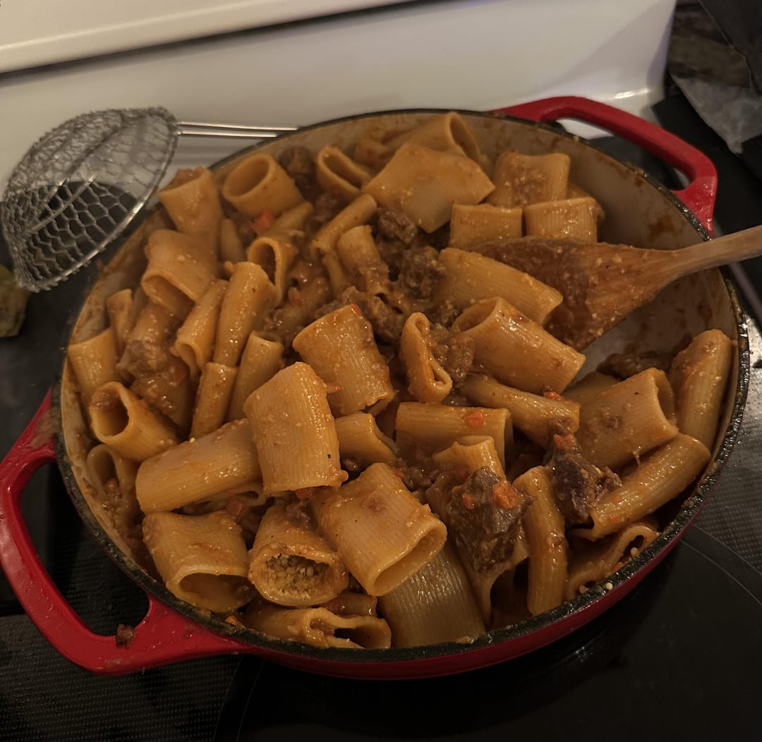 Boil pasta to a hard al dente. Ladle pasta with some pasta water into skillet and return skillet to hard simmer/boil to finish pasta in meat sauce.
