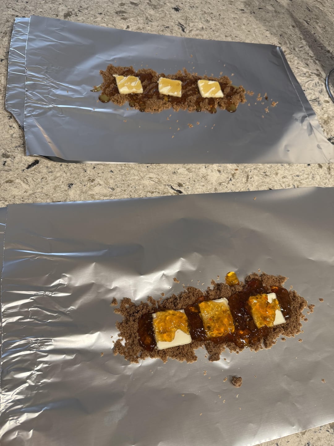Smoked at 275 for 2.5 hours, spritzed with apple juice at the 90 minute and 2 hour mark. Wrapped each in foil meat side down with brown sugar, butter, hot pepper jam (honey hog hot rack) and honey (honey pecan). Smoked for another 90 minutes meat side down.