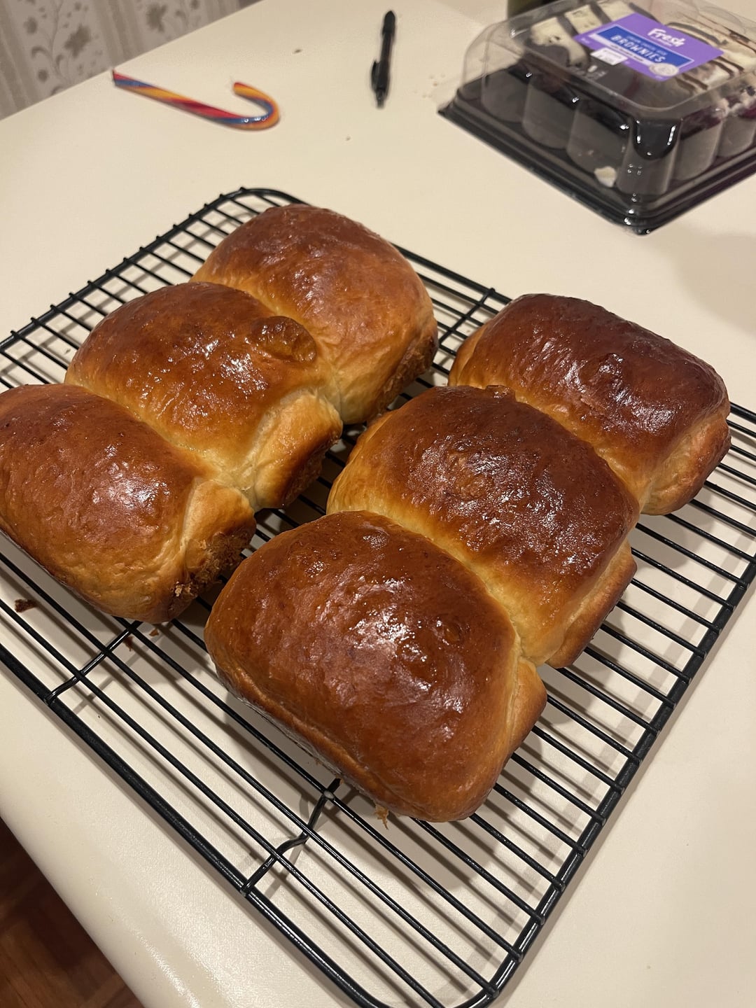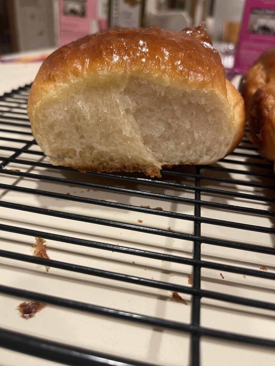 I decided to make Tini’s milk bread rolls. I did not have dry milk powder so I just omitted it. It took significantly longer to rise than her recipe, but I was patient and I think they turned out great. I also only had jumbo eggs and got a double yolk with no impact on the recipe.