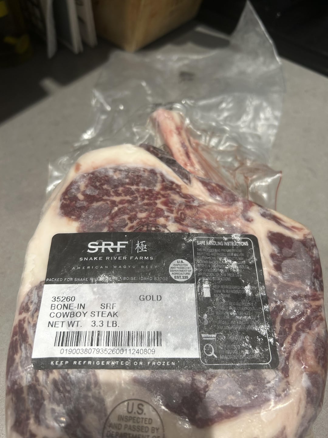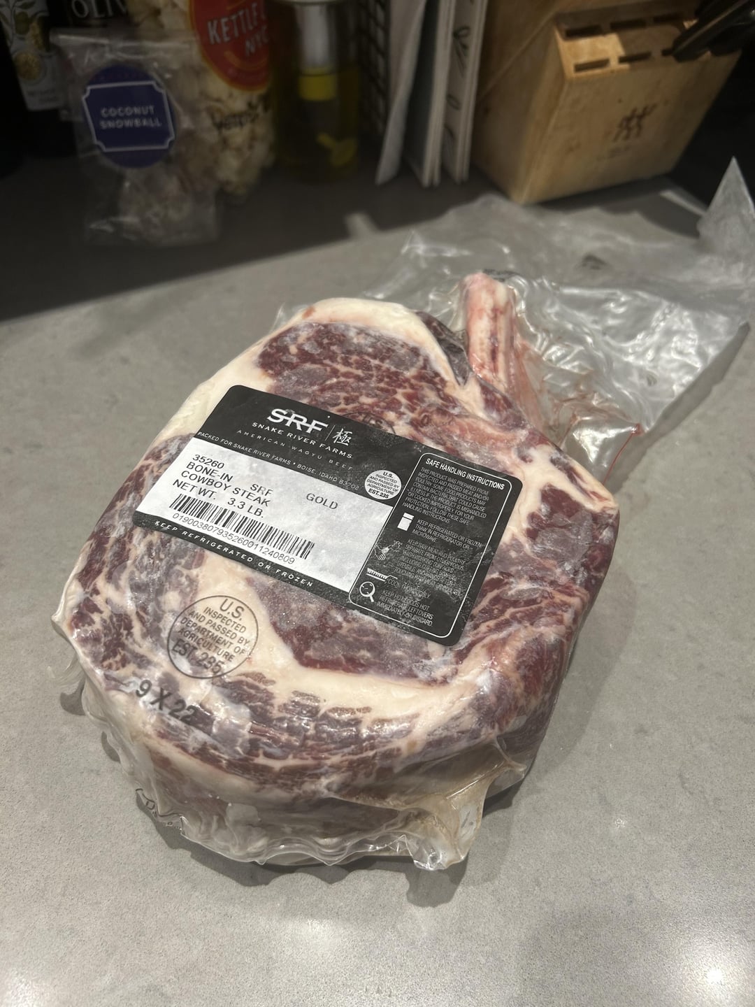 *** The background: I have a tradition of treating myself to something special and cooking an amazing meal every NYE. I often have company but this year it’s just me.***** Despite planning to spend the evening solo, I decided to go big with a cowboy steak from Snake River… and well I guess I was a good girl this year because instead of the ~ 2.5lb steak the website touted, they sent me this 53 ounce MONSTER. And so, I find myself a little overwhelmed.