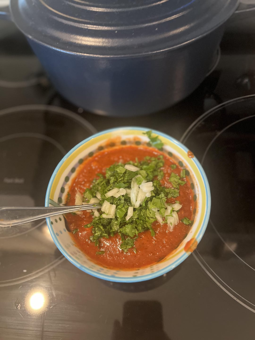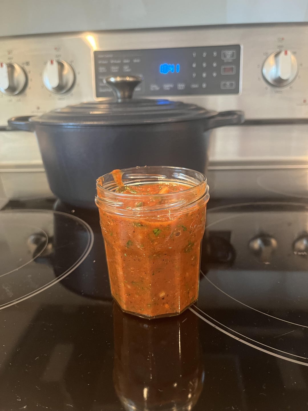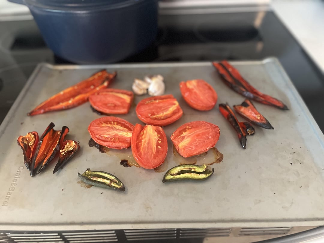 3 Roma tomatoes, sweet red pepper, three jalapeño peppers, a spicy Jane pepper (from our garden) and a fistful of garlic roasted in the oven at 350 F for 20 minutes and then broiled.