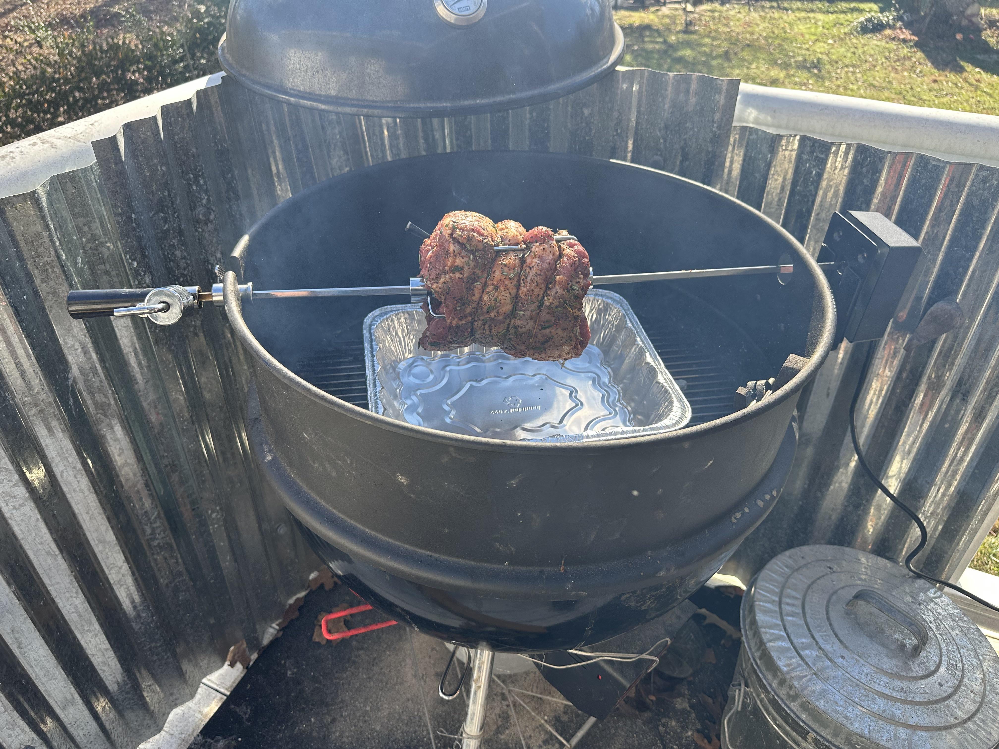 Decided that meant I needed to use the rotisserie. Super windy today, and I may have had too many coals to start (a full basket). Temp got up to 330. Removed half and it’s doing better. Venom isn’t even kicking on because of the wind.