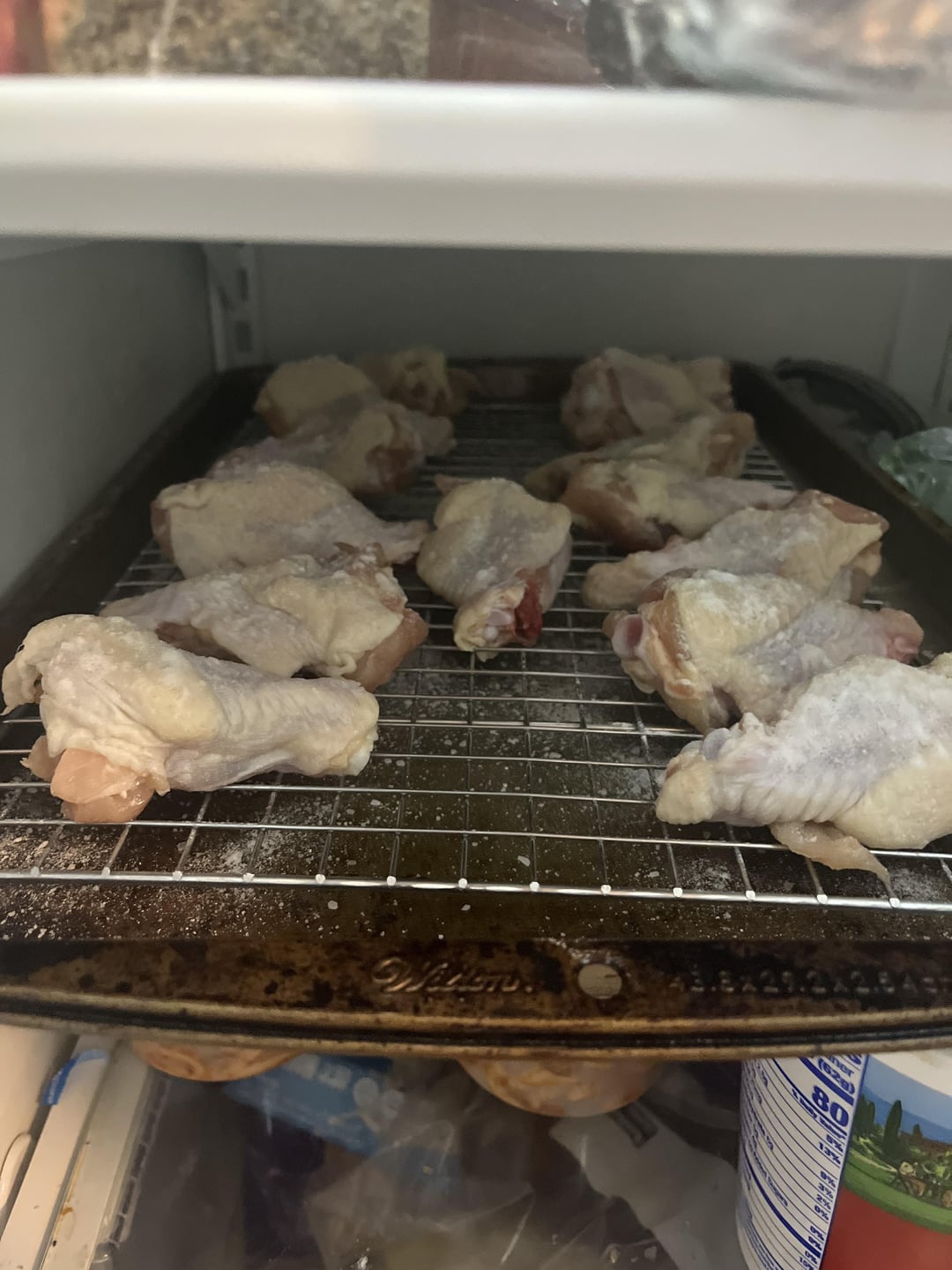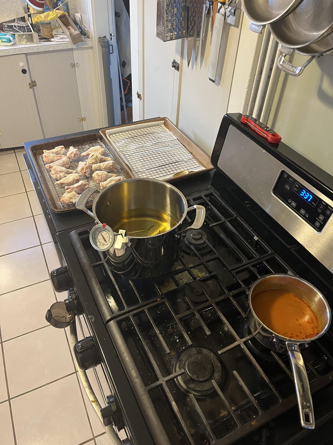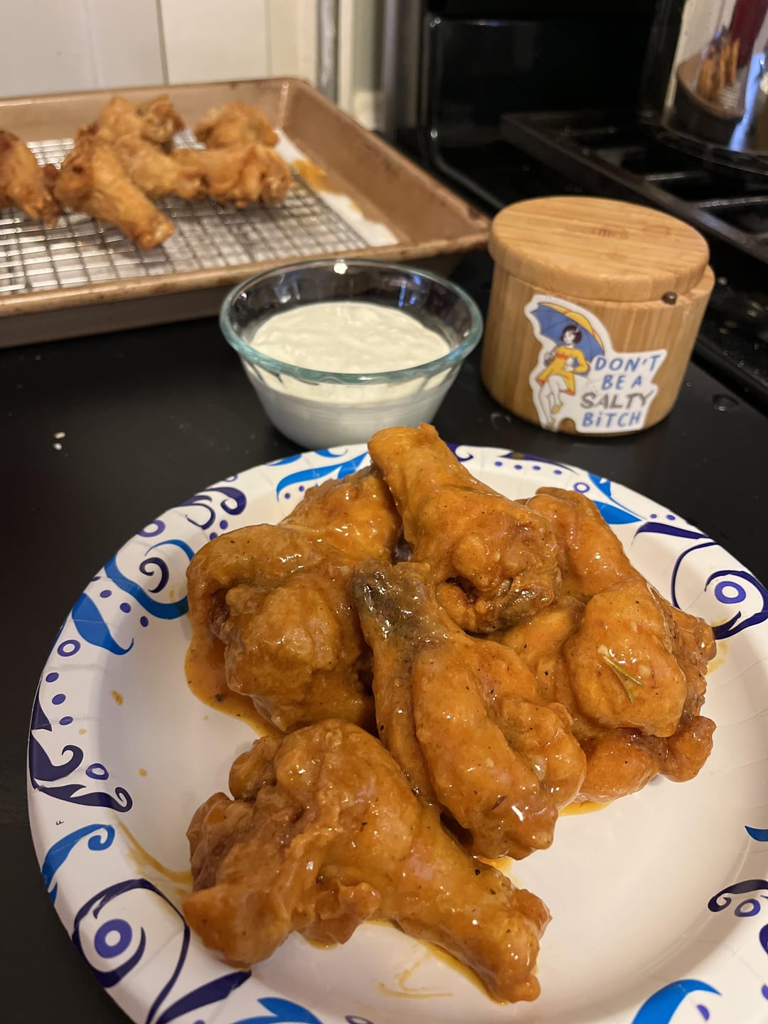 Homemade Buffalo sauce w/ rosemary. Wings dried overnight with baking powder and kosher salt. Dusted with cornstarch and a little AP flour. Two stage fried. Home made blue cheese .