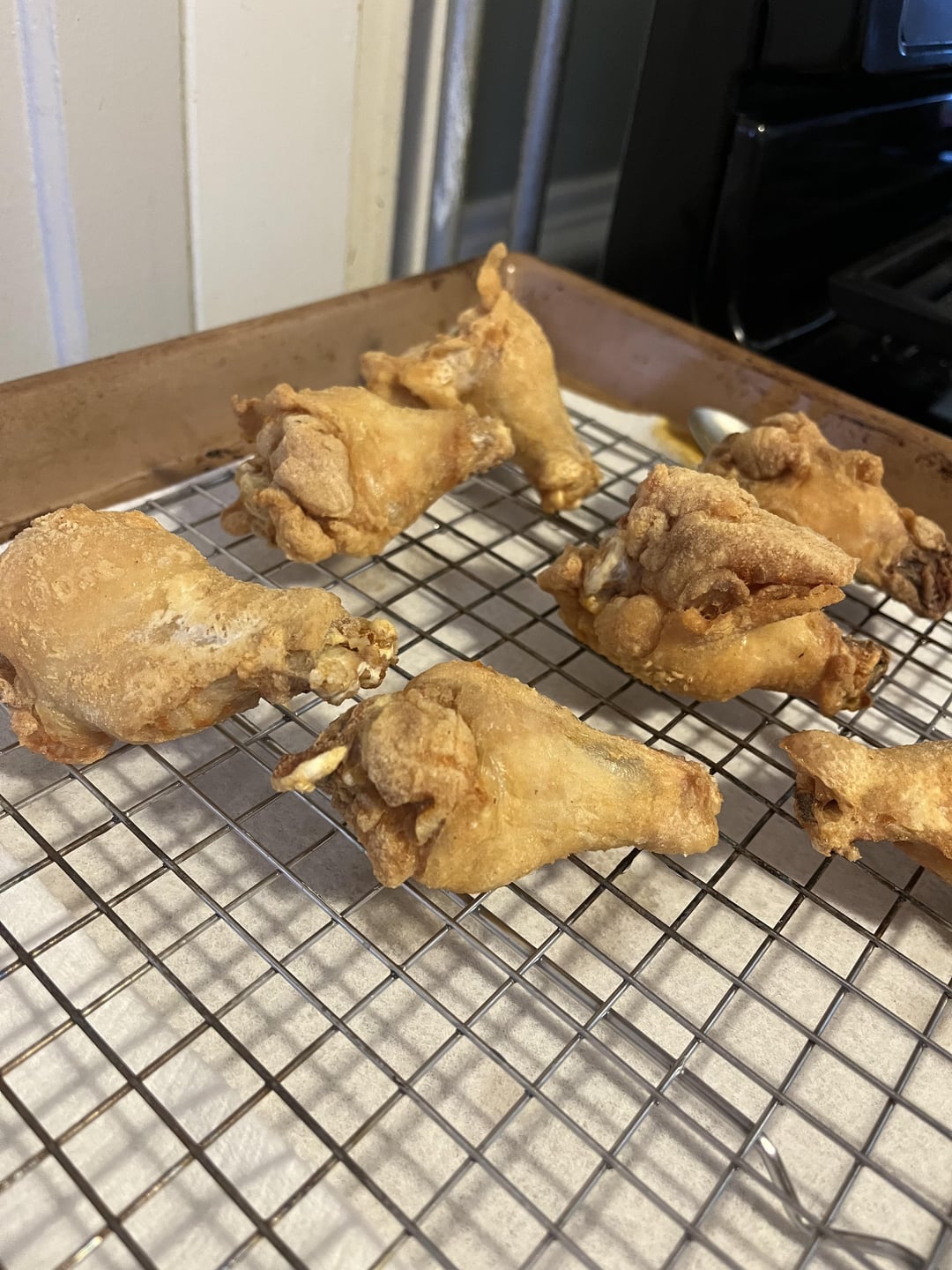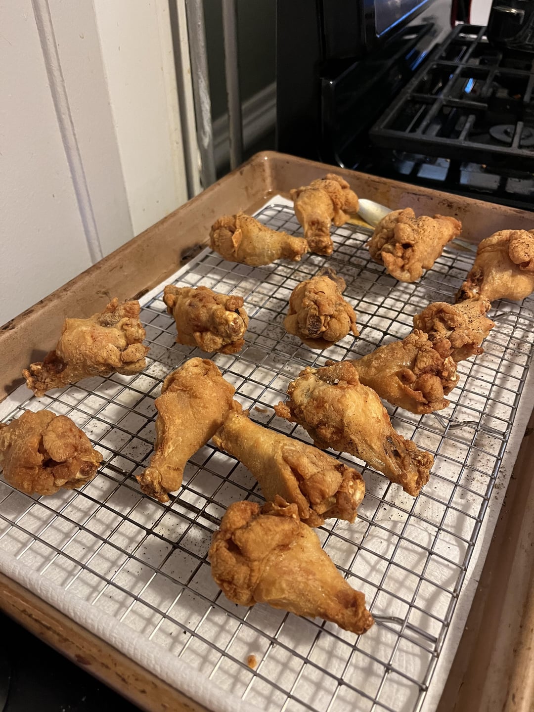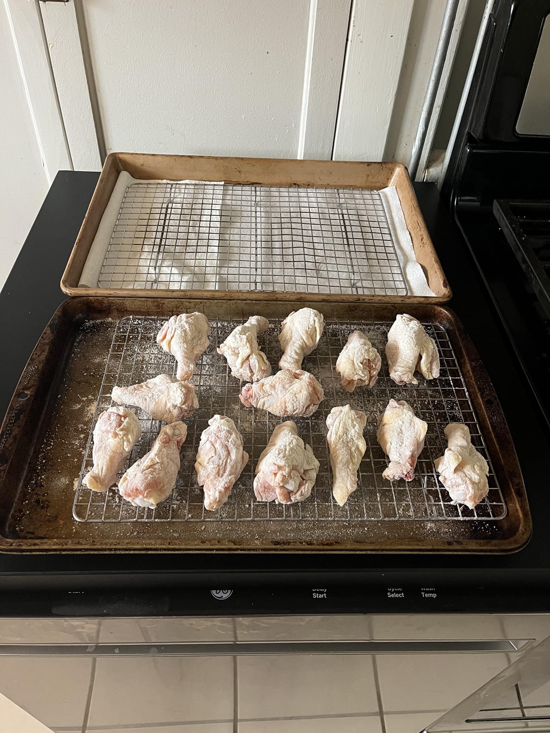 Homemade Buffalo sauce w/ rosemary. Wings dried overnight with baking powder and kosher salt. Dusted with cornstarch and a little AP flour. Two stage fried. Home made blue cheese .