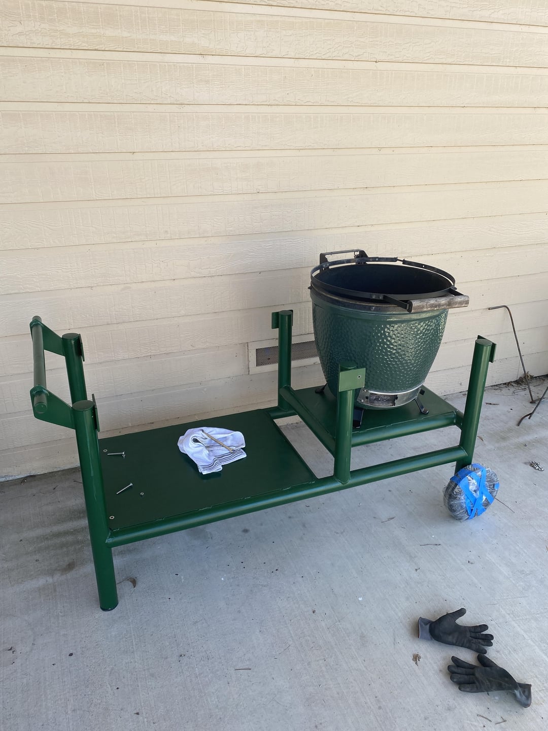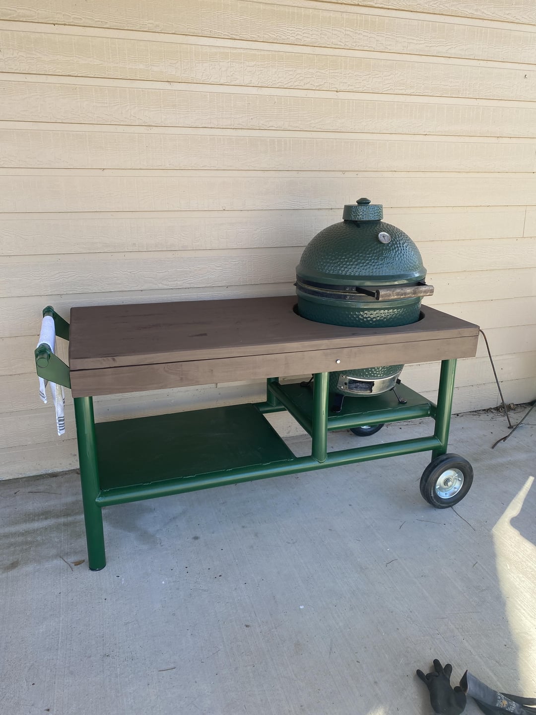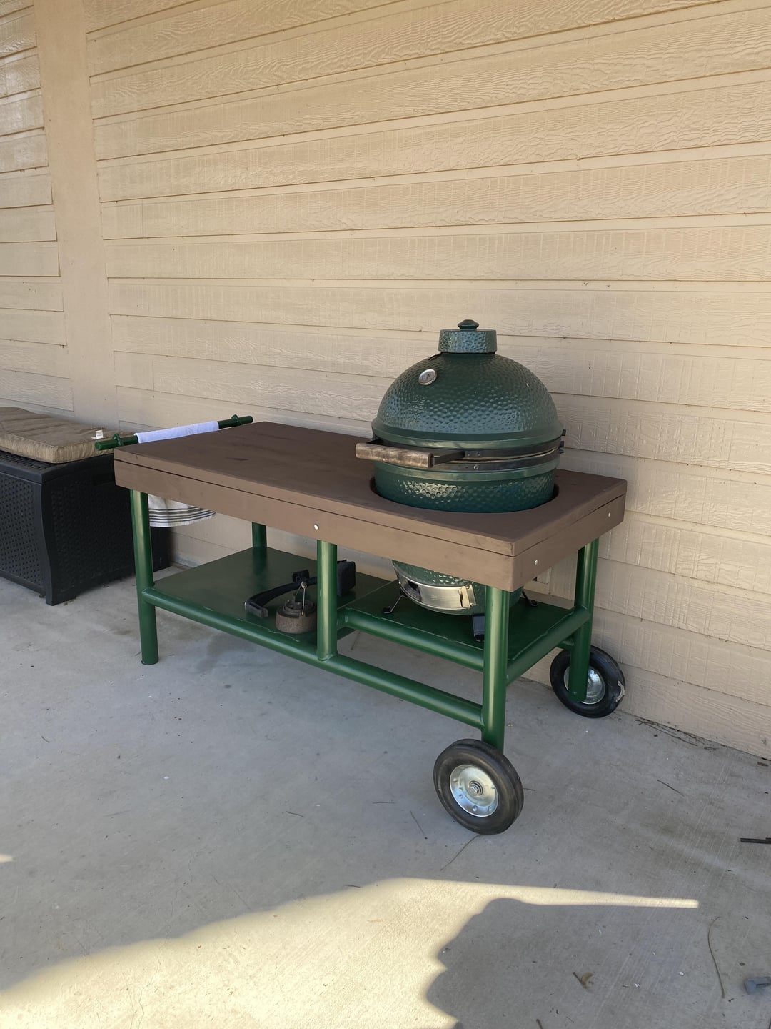 I built this table for a large BGE that I inherited from my late uncle. It’s very heavy and not exactly that portable but can be moved around. It’s constructed out of 2” steel pipe I had laying around and some lumber from the big box store. The top is made from 2×8 that I ripped the edges off with circular saw, used pocket hole system and glue to make a pretty smooth seamless top.