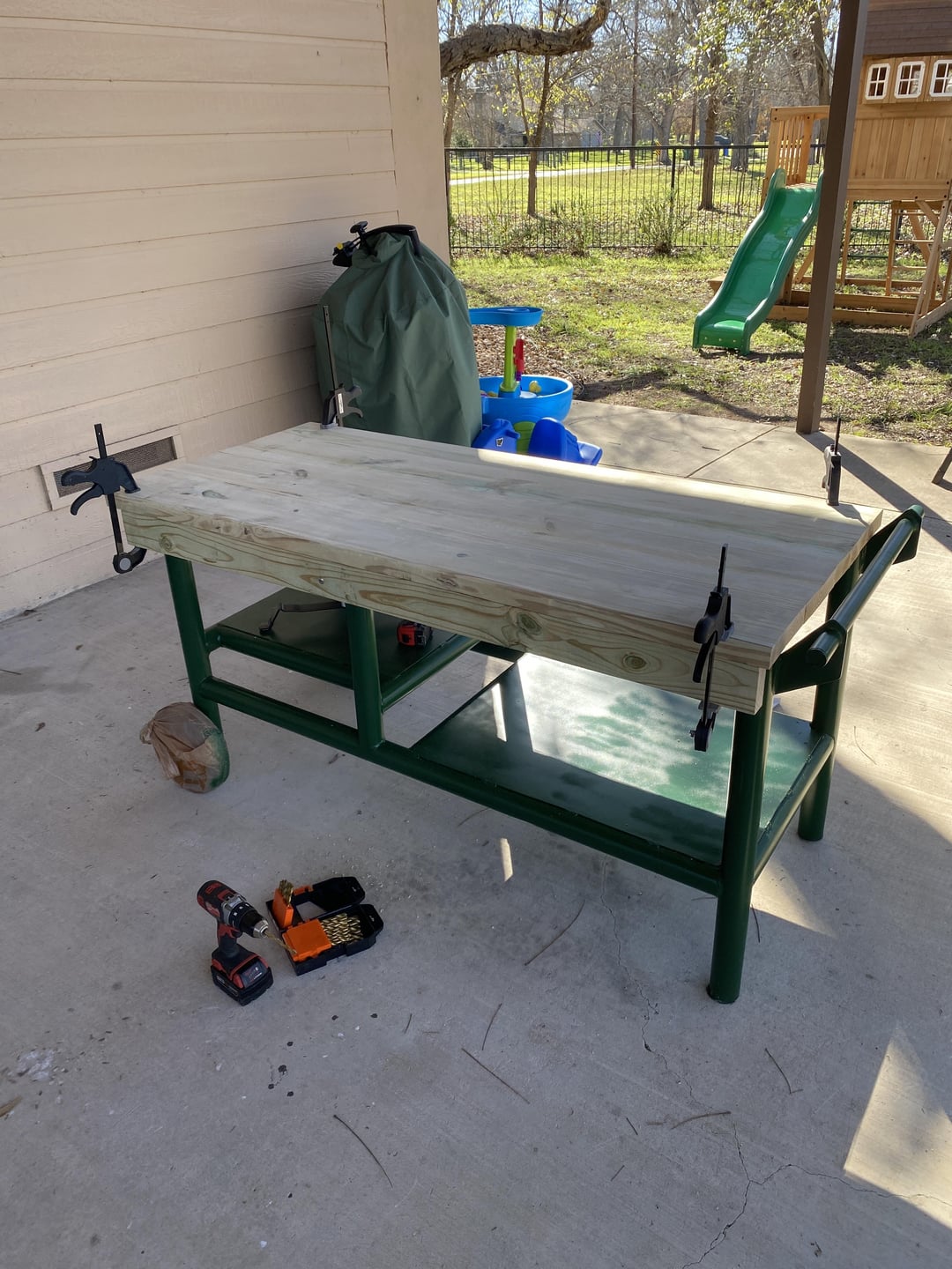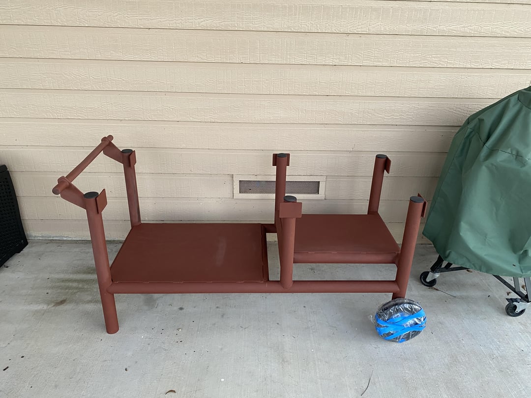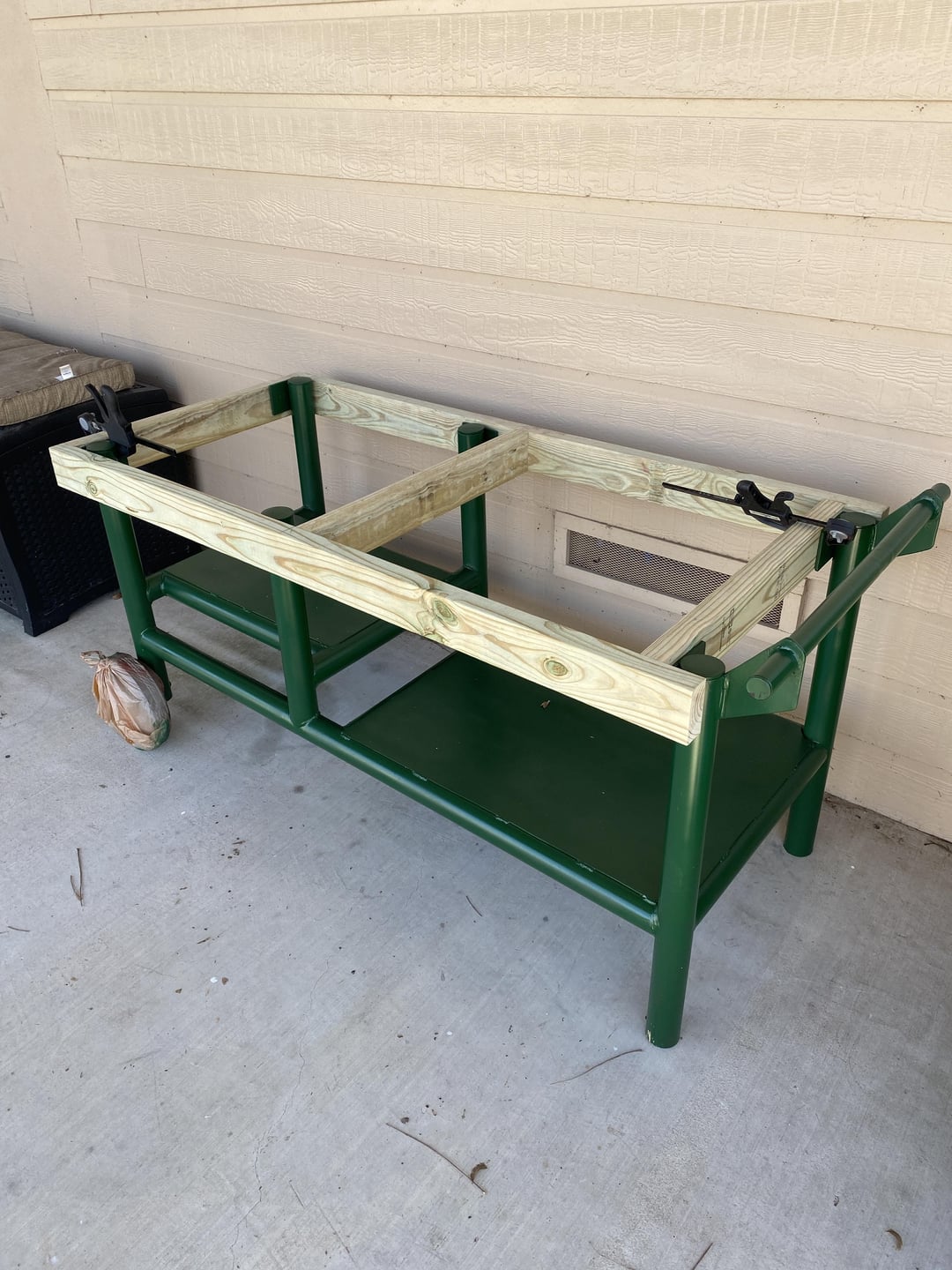 I built this table for a large BGE that I inherited from my late uncle. It’s very heavy and not exactly that portable but can be moved around. It’s constructed out of 2” steel pipe I had laying around and some lumber from the big box store. The top is made from 2×8 that I ripped the edges off with circular saw, used pocket hole system and glue to make a pretty smooth seamless top.