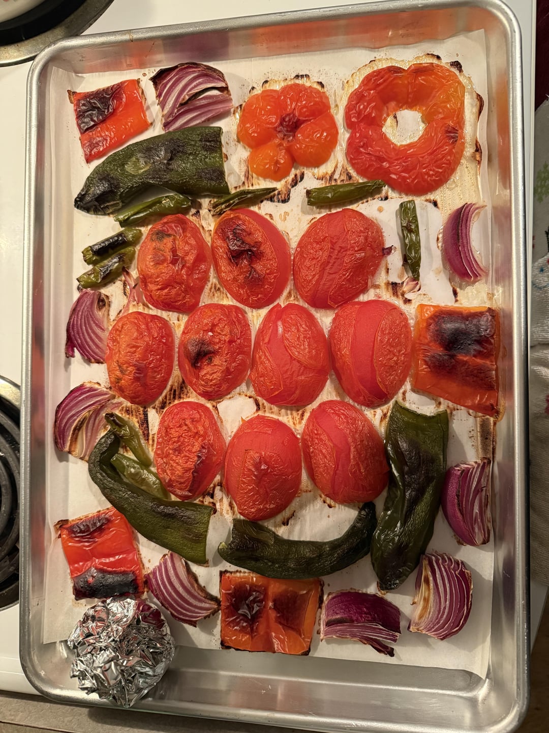 Cut peppers, tomatoes, and onions and place on a parchment-lined baking sheet.