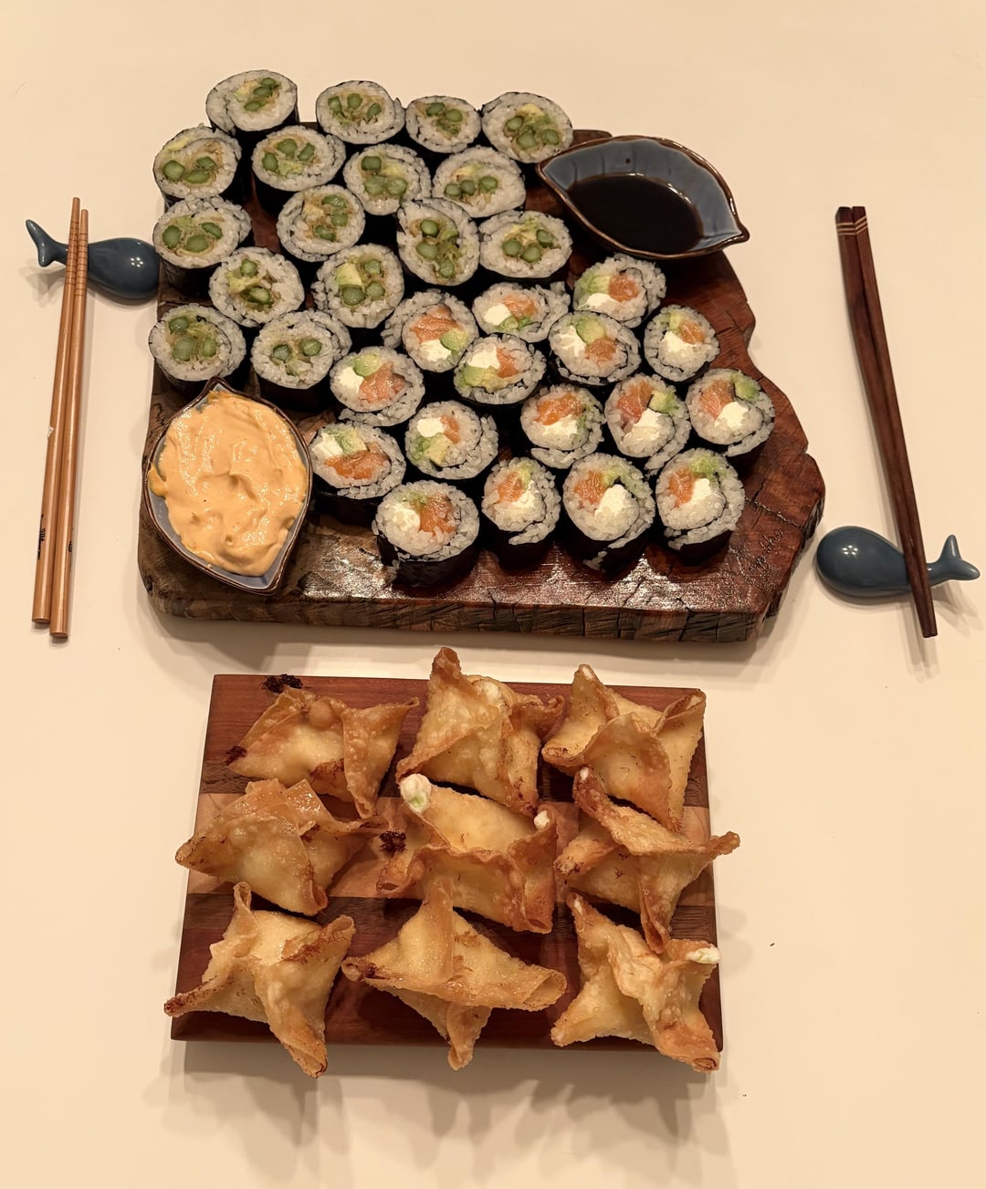 First time making sushi and crab rangoon’s. Learned a few lessons, but overall very happy with this first attempt! Will be the first of many!by Disciplined_Jello 6 Comments Witty_Revolution_492 1 year ago This looks amazing, great job!! Chapstickie 1 year ago Haha. I don’t like cream cheese in my sushi but I too love a couple crab rangoons as a side for sushi. Wide_Comment3081 1 year ago Those plates wow Jack__Flap 1 year ago I’m not a fan of what you put in your rolls, but they look fabulous for a first attempt. Nice job. John-the-cool-guy 1 year ago I never considered asparagus for sushi. Interesting. I must try it.Nice work! Disastrous-Resident5 1 year ago You’re telling me a crab ran those goons?Write A CommentYou must be logged in to post a comment.