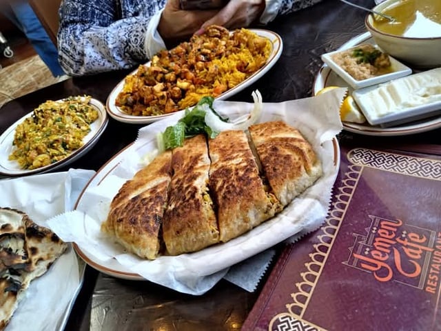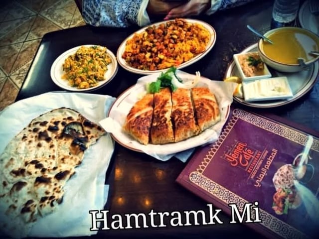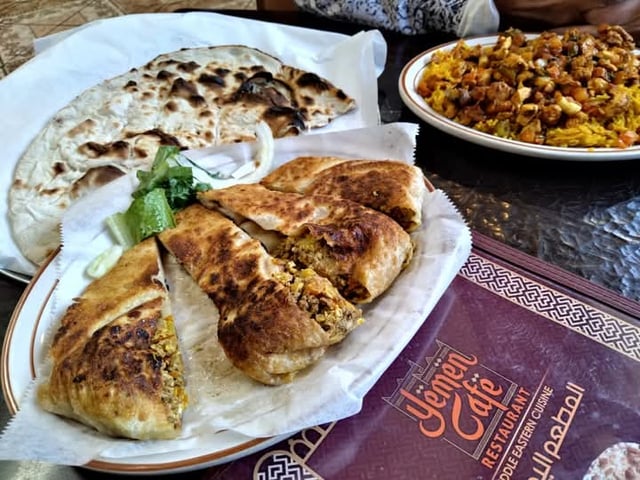 Day 6 sandwich week, that’s all folks. Holy Wowed by Mutabbak Bread stuffed with (Ground beef or Eggs) mixed with Tomatoes, Onions, & seasoning Choice of Ground beef or Eggs. I had both Eggs and Beef. It’s like a mega stuffed pastry a instant addiction 😁💯. The most delightful sandwich Yemen Cafe