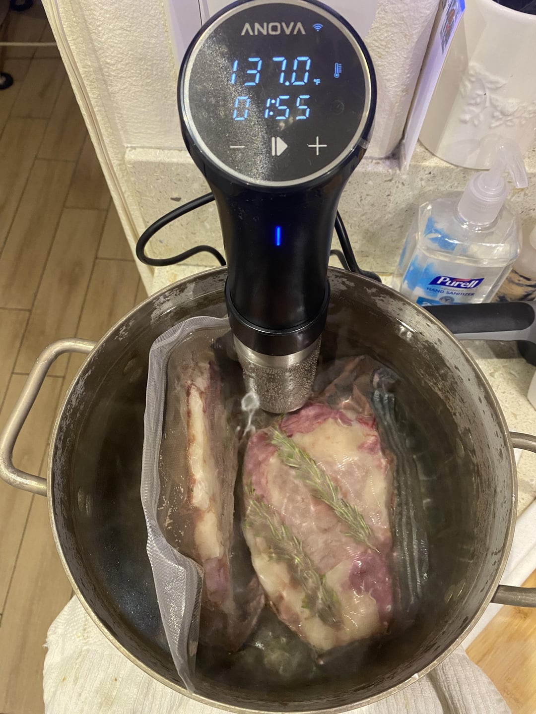 Got a sous vide machine for Christmas and cooked up some ribeyes for NYE. 137° for a little under 2 hours. I bought a ribeye roast and cut 3 about 1"-1 1/2” steaks from it. The fat of a ribeye is my favorite part and it practically melted in your mouth. Will be doing again with some chicken breasts this week.