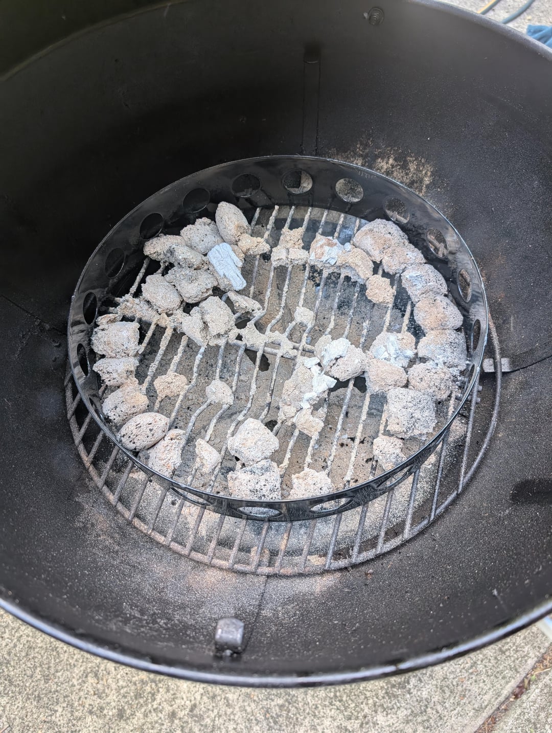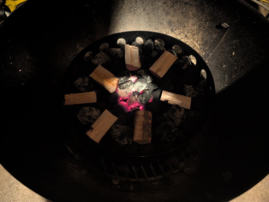 Lit the centre of the ring, placing smoking wood chunks around the ring in the way I assumed the fuel would burn. Placed diffuser plate and lid on, waited for pit temp to rise and adjusted vents