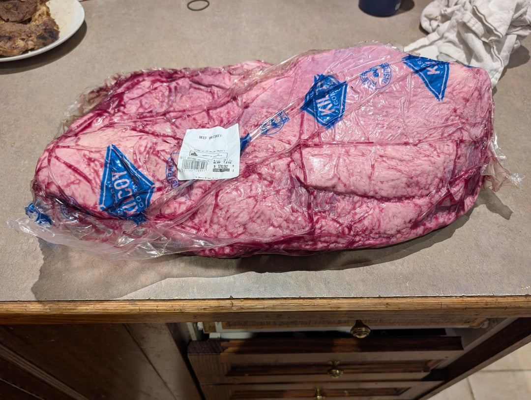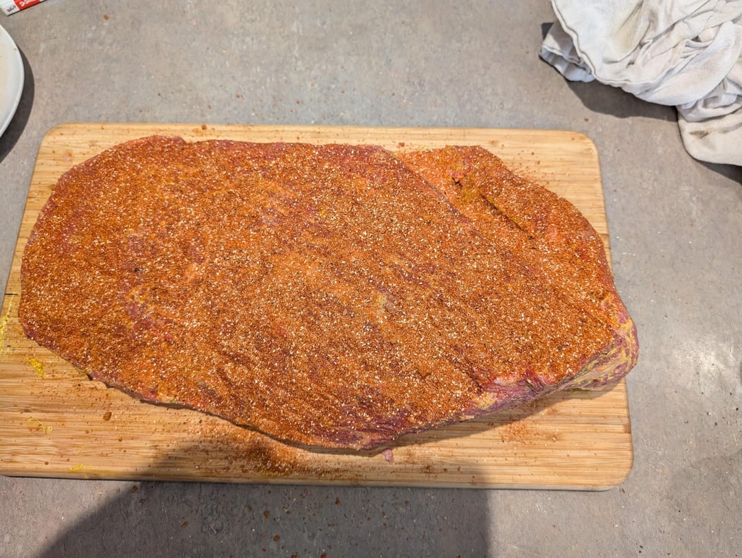 2 foil trays 1/2 full of water placed directly on diffuser plate with some foil packers in the centre to level out the trays. Grill plate on and 6.5kg trimmed brisket on. Lid on at 12:00am.
