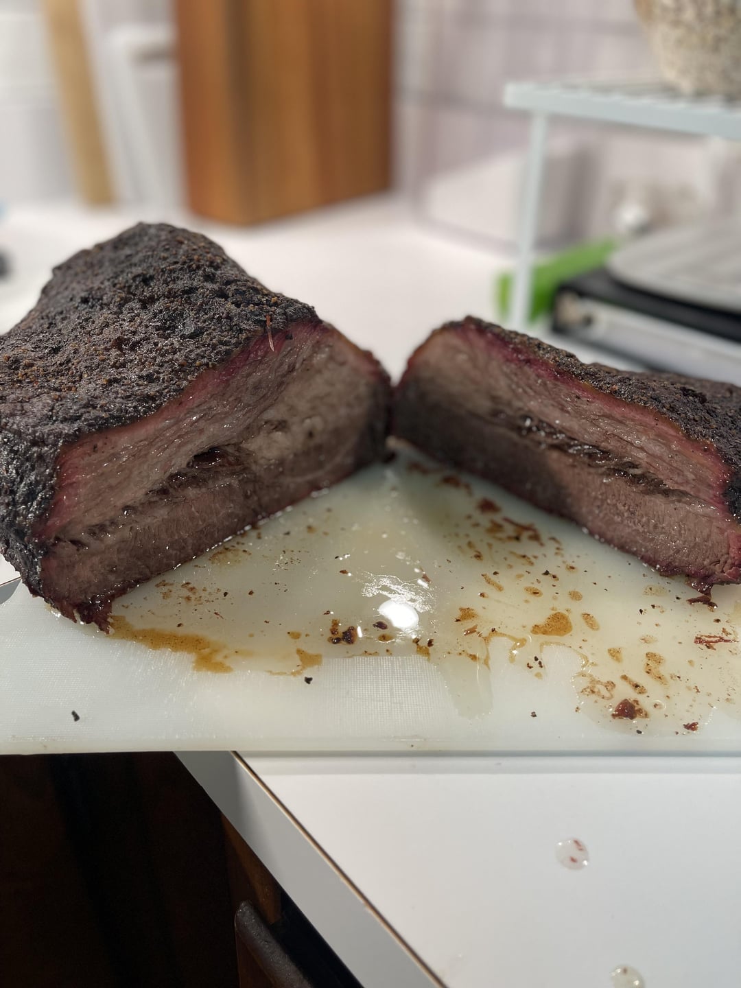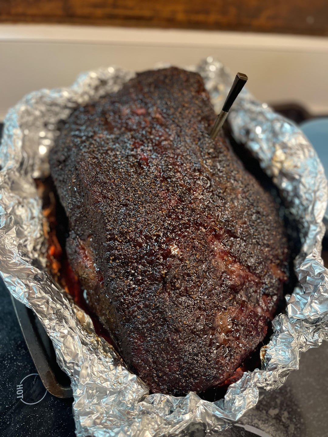 Happy New Year! I trimmed and smoked a 16lb brisket from The Butcher Shoppe in Pensacola, FL. I must say this was one of the best briskets I have smoked. The marbling was insane and the trim was minimal. It was smoked on my large BGE using the double indirect method with a SLO Roller. I pulled it at 195, and rested it in foil for 16hrs. Tell me what you think?