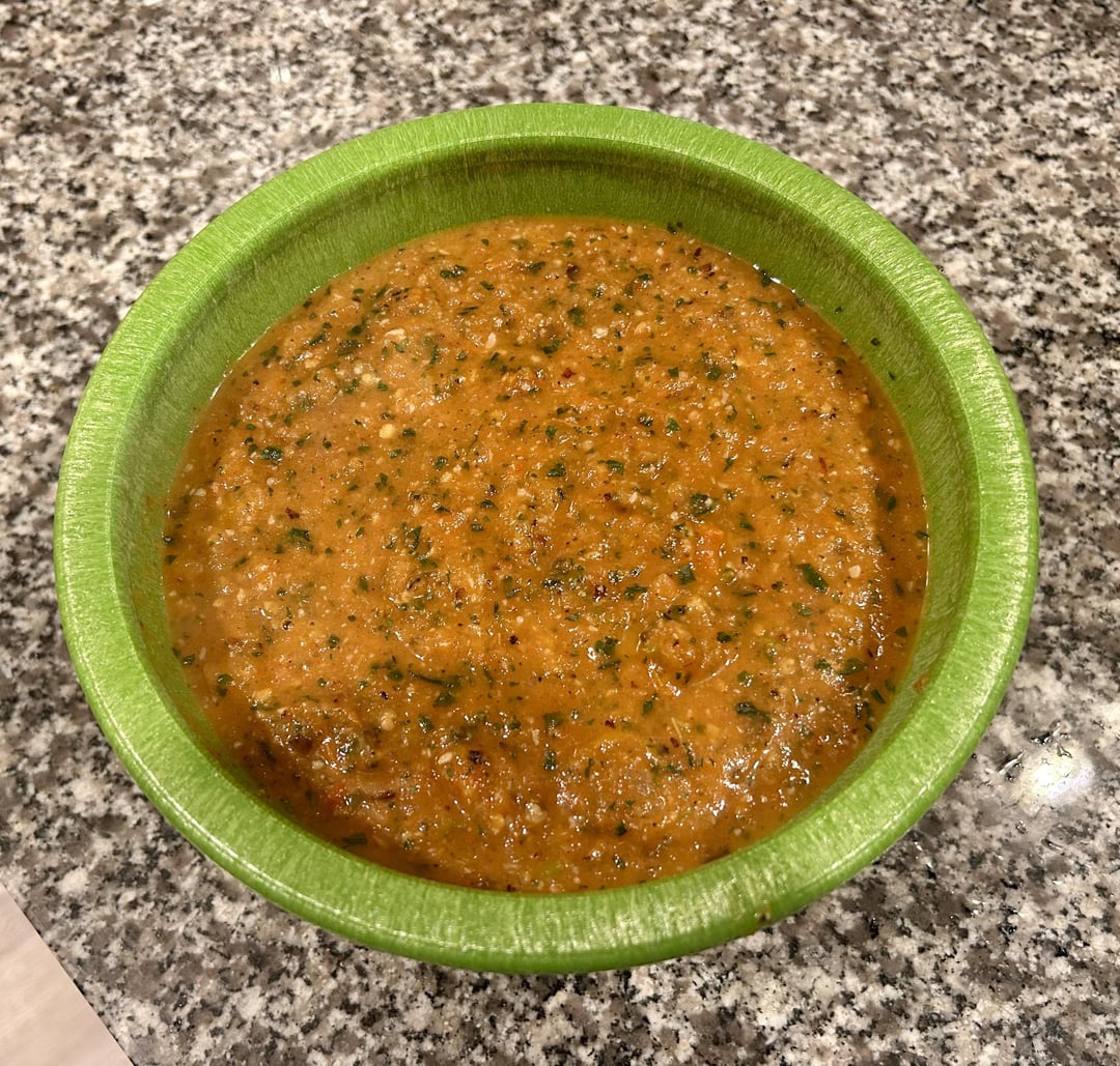 6. Add all ingredients (including cilantro, seasonings, the baking sheet juices, and lime) to blender along with half of your pepper/tomato puree. Blend until your desired consistency. Taste and add more seasoning and pepper/tomato puree until you get your perfect taste. I ended up using the rest of the puree and added some more salt.