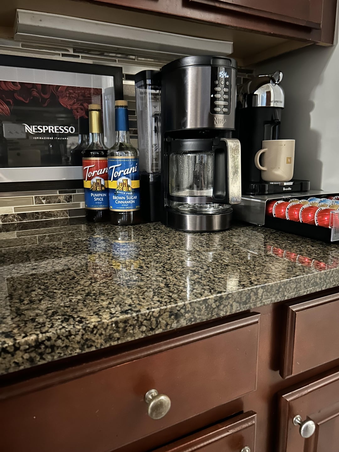 Looks awesome! I love having a coffee bar and a dedicated space. It makes it so much easier to take my time and enjoy coffee in the morning. I love your whole color scheme with the countertop, backsplash, cabinet, and your setup! Beautiful space