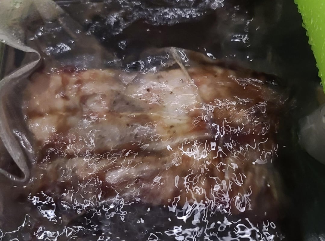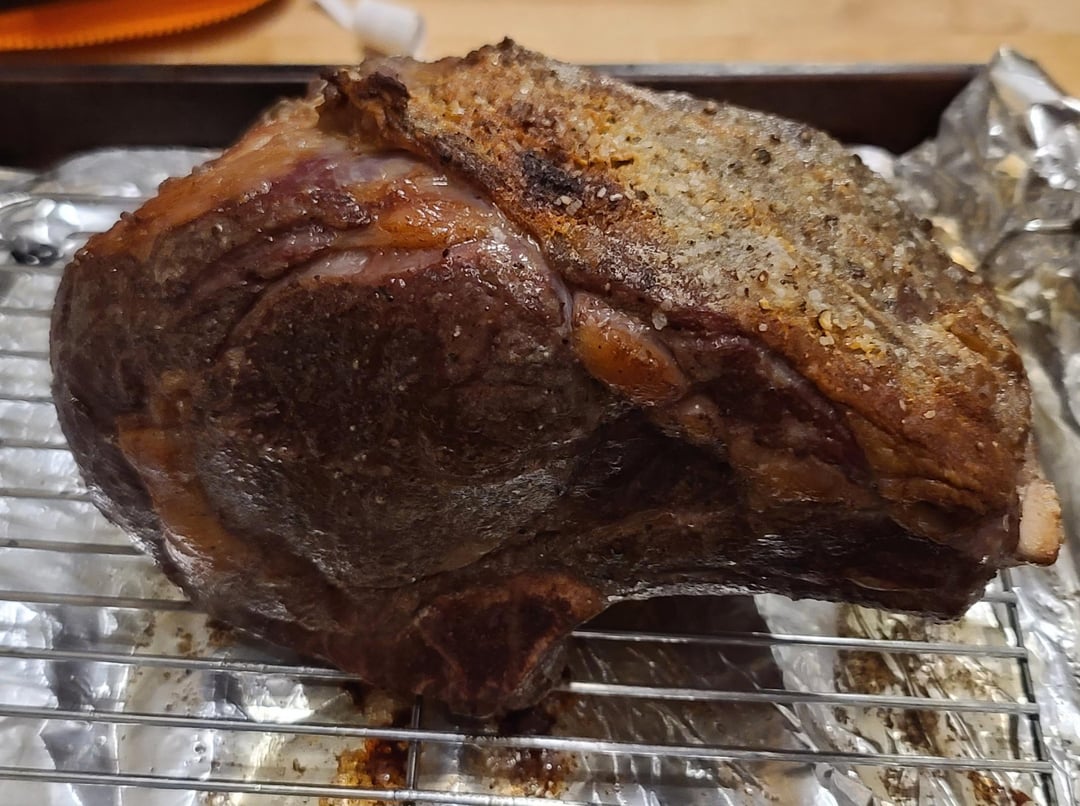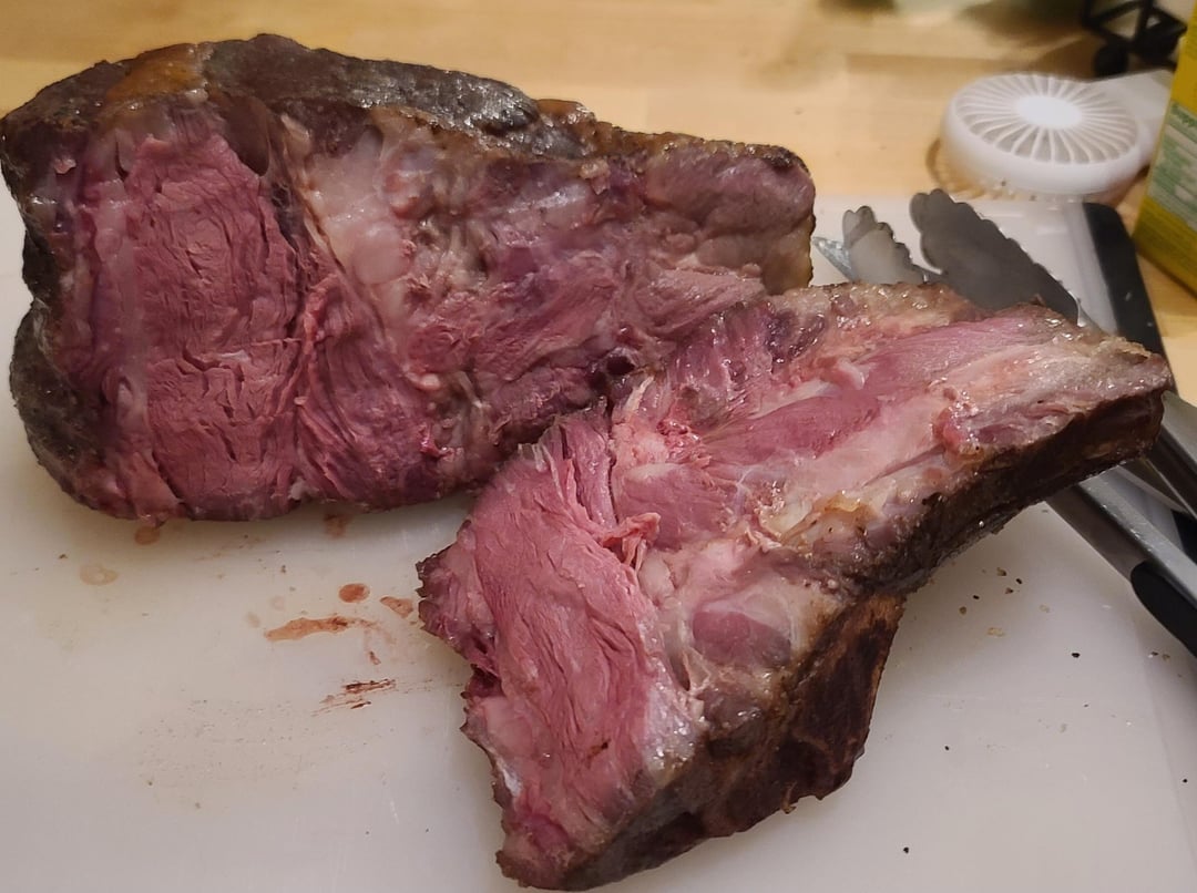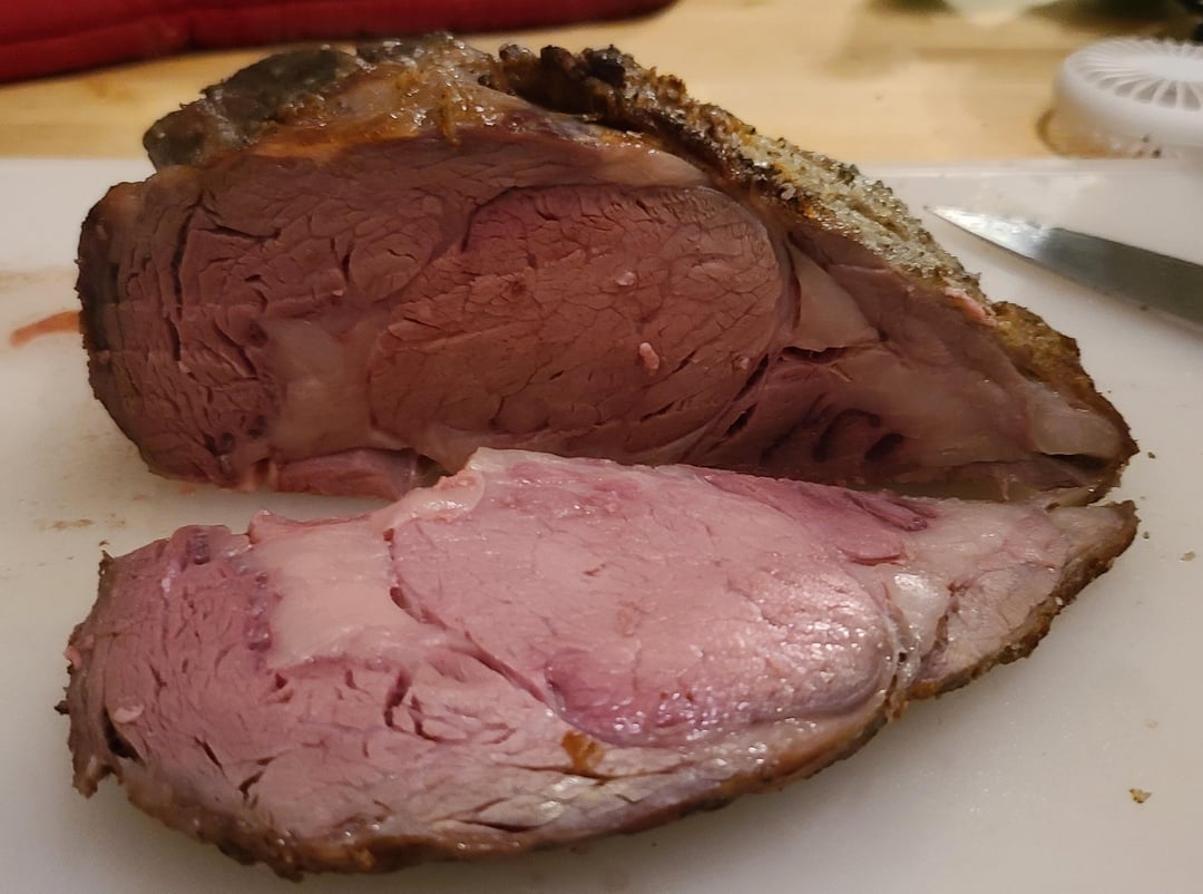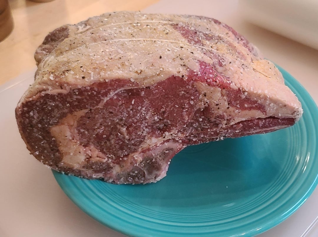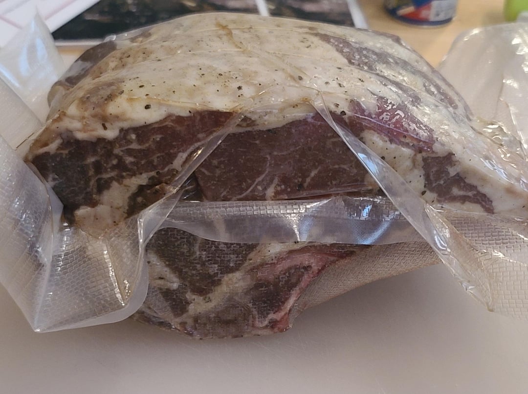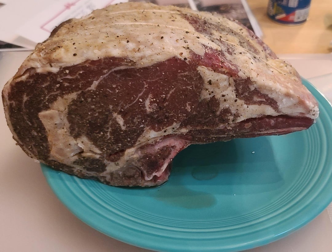5.4 pound 2 bone rib roast. Overnight dry brine with salt, pepper, garlic powder. Into the bath at 137°F for 11 hours. Pat dry, slather with butter, re-season, then into a 500°F oven for 15 minutes.