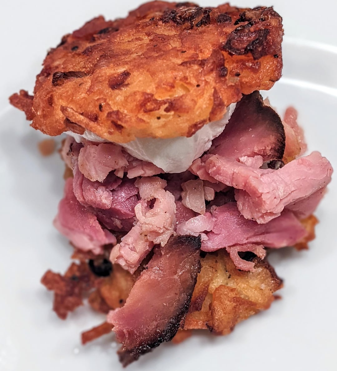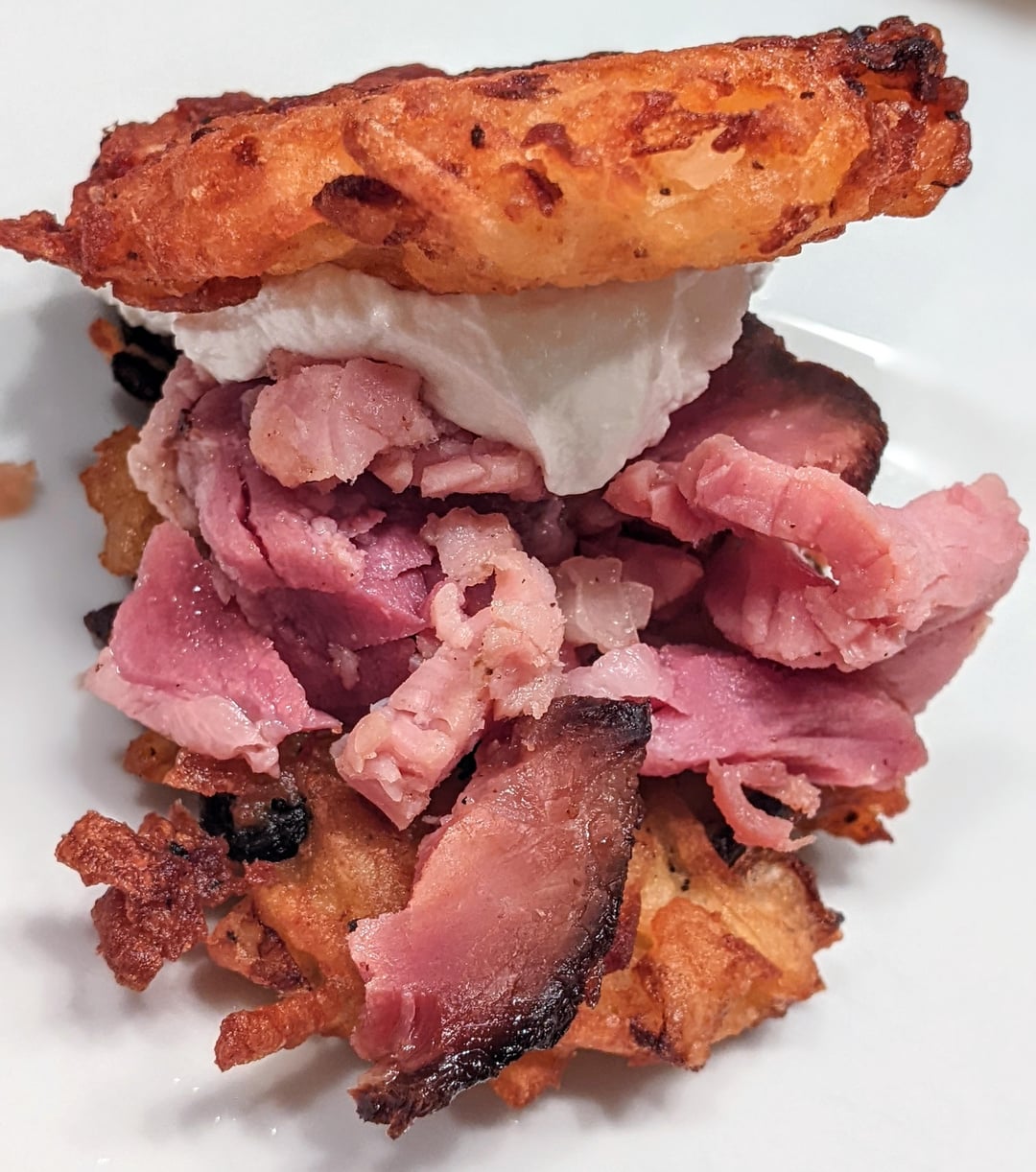 My homemade Hanukkah latkes and my wife’s leftover Christmas (Honey Baked) ham. Plus sour cream. Can’t explain how frickin good it was, way surpassed expectations <swipe> Happy New Year!