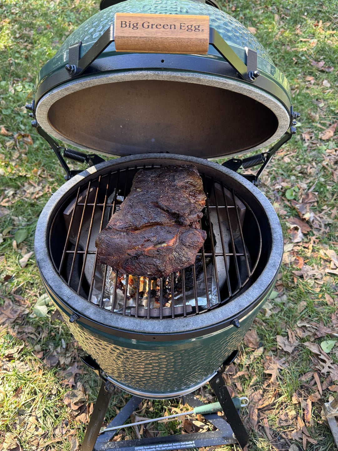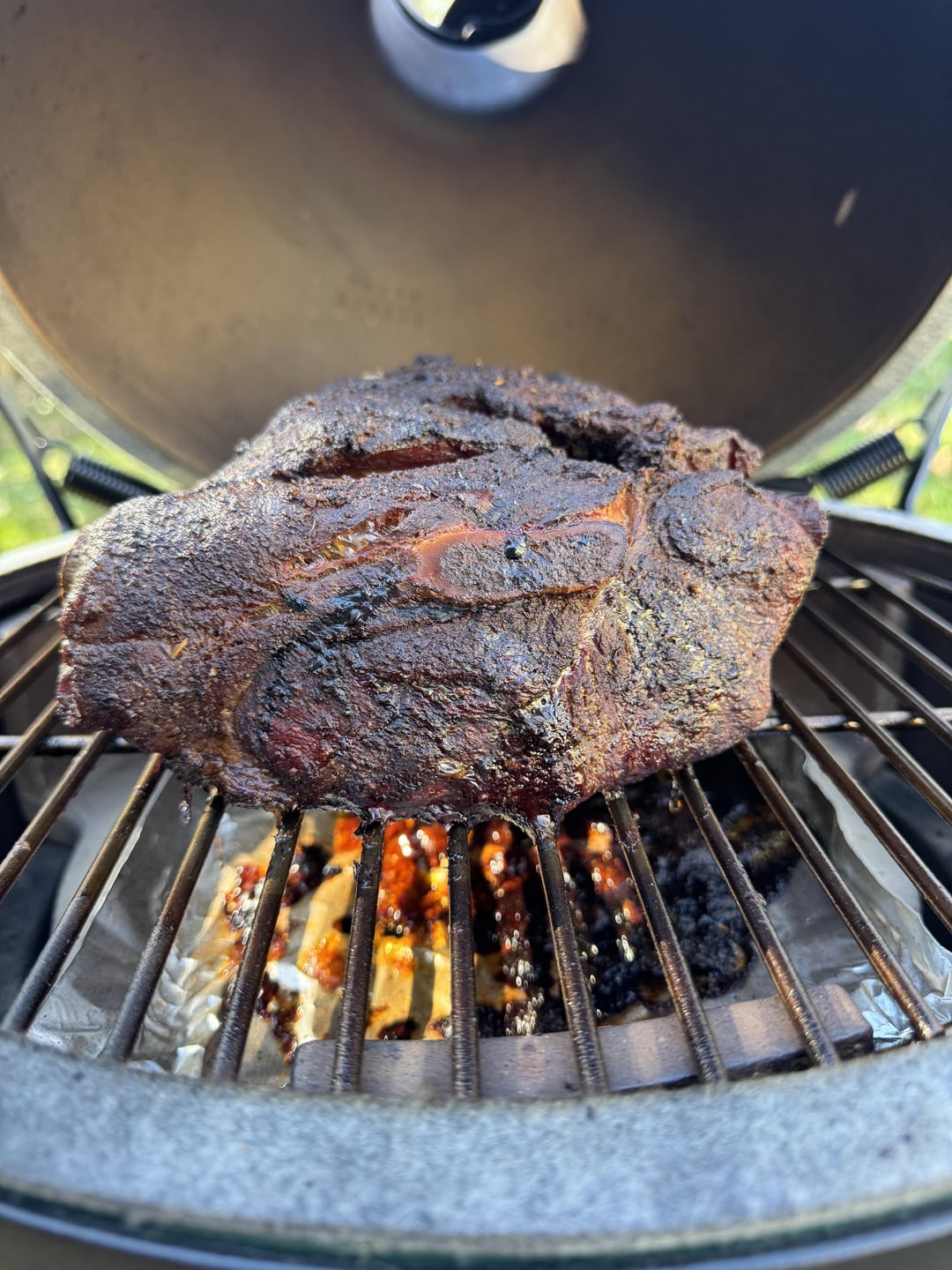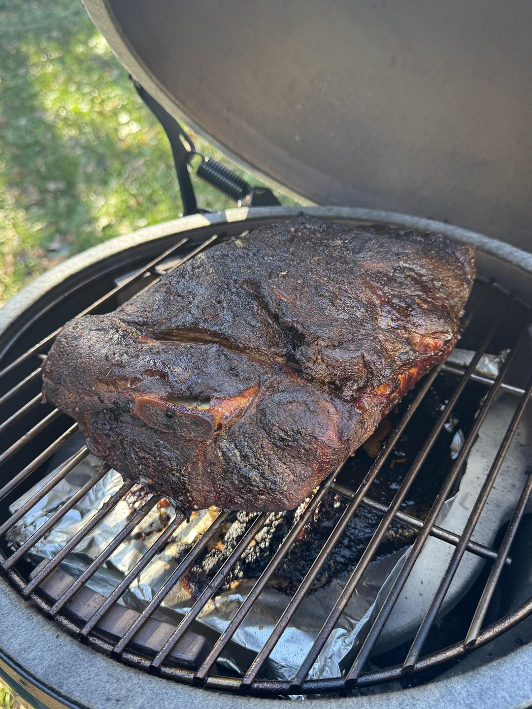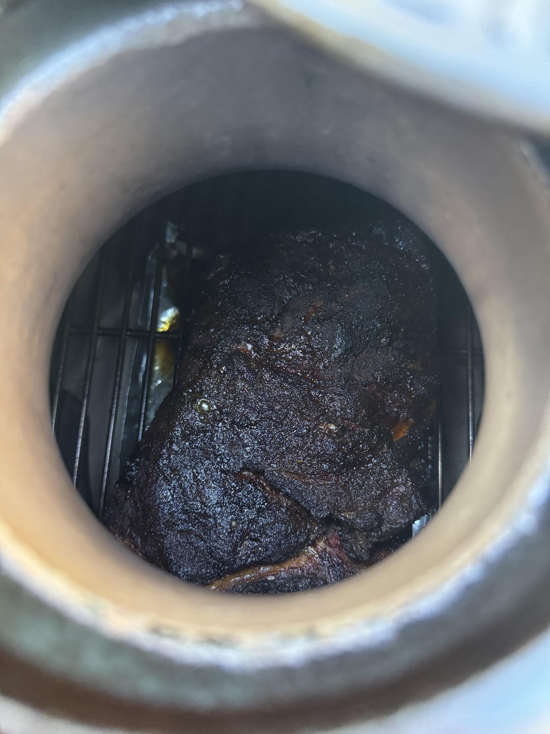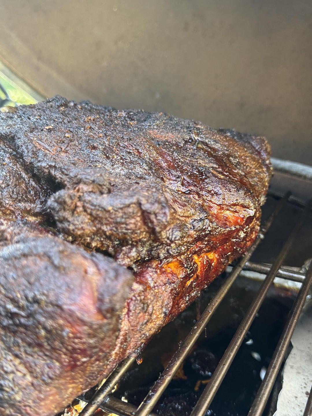15 hours between 205°-250° fluctuating. Covered in yellow mustard with a rub I found online. Can’t wait to get it out of the cooler later