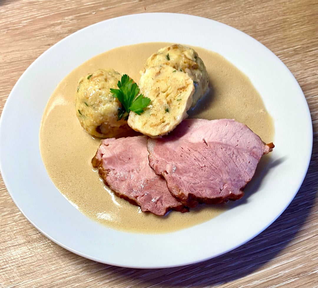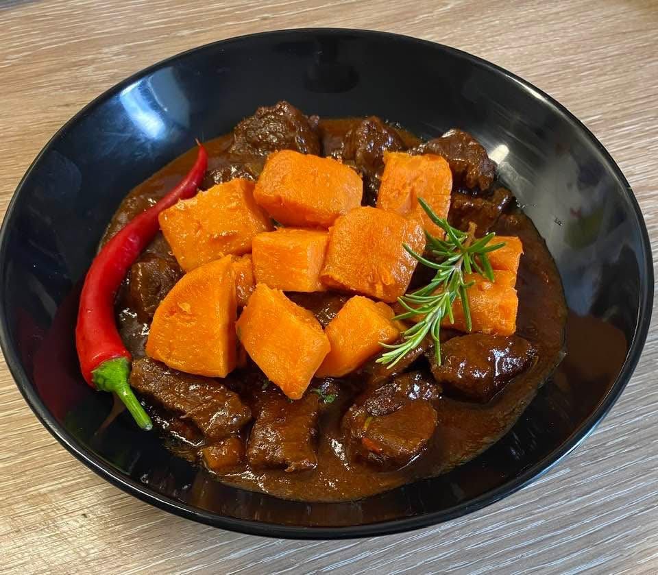 Beef Burgundy in red port wine with roasted sweet potatoes and Horseradish sauce and pastry dumplings and homemade smoked meat my friend Helen.