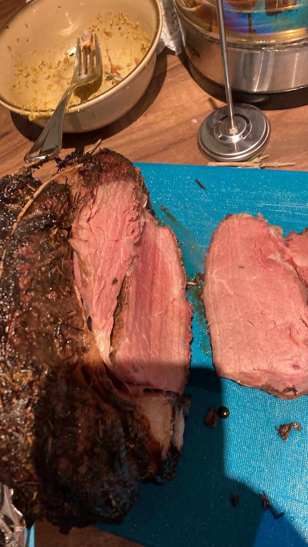 Made a herb butter crust with rosemary, thyme sage, salt, pepper and chopped shallots. Roasted it standing fat and crust at the top. 232 C for 20 minutes 163 C for 50 minutes. (11-12) minutes per pound.
