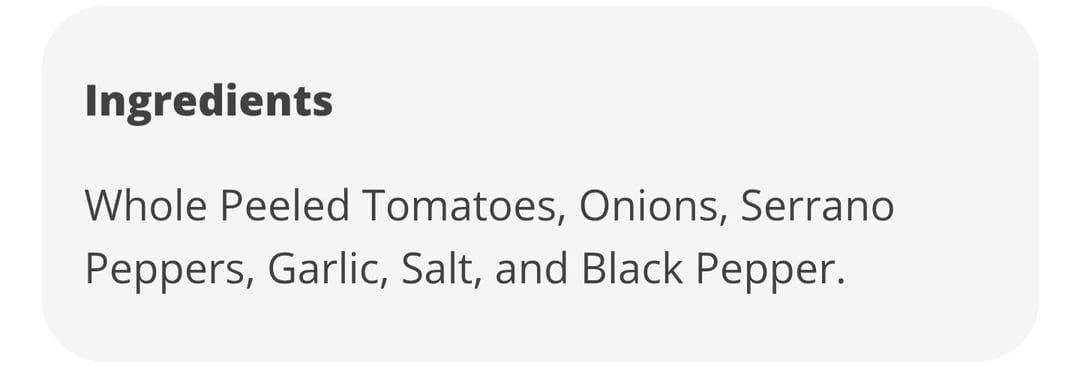 Hmm, based on ingredients and the photos I’d say; Canned whole peeled tomatoes(drained), onions and peppers boiled. All blended together with some water then simmered/cooked in a little neutral oil. Taste for salt and black pepper. Way more salt than you would think. For about 24oz of product, I’d go no less than 1 teaspoon of salt.