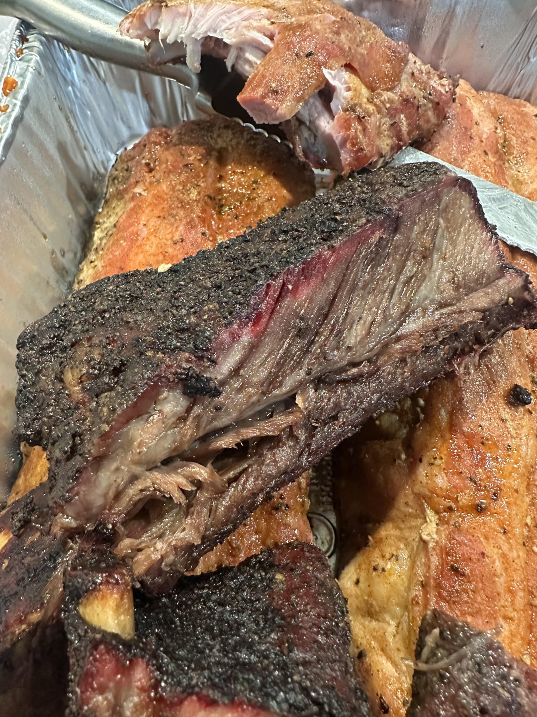 The family and extended family requested Ribs. Did two racks of Dino ribs, 6 racks of pork baby backs, and a single rack of beef back ribs.