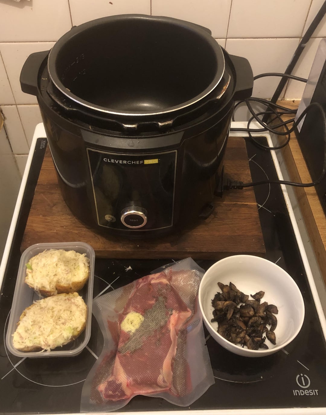 Todays dinner prepped and ready. Sous vide rump steak, stuffed jacket potato, mushroom and pepper corn sauce. I’m not sure if il have broccoli or asparagus with it.