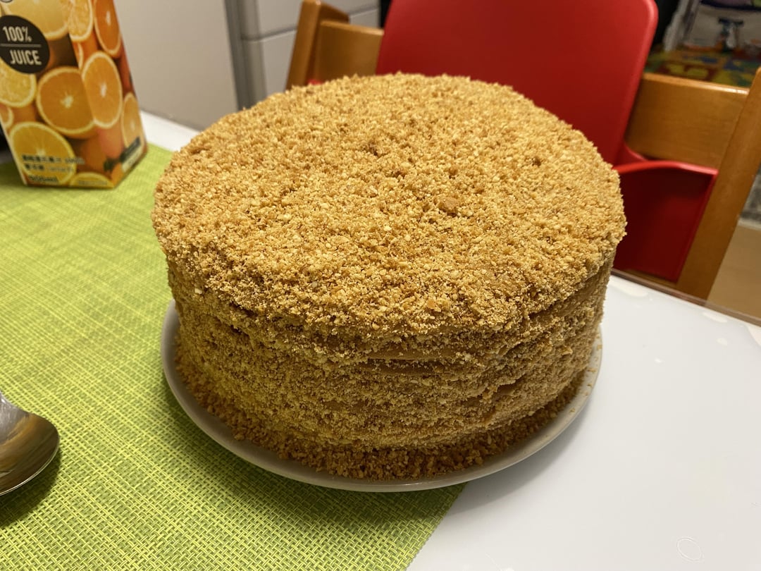 I was not going to post it, but it turned out so so good! My family used to make it every single year when I was a child. It is medovik-based recipe, but the filling is dulce de leche + butter. The final result is perfectly moist, rich and decadent cake!