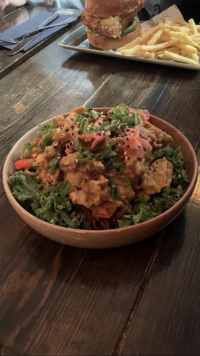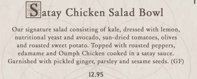 ((consisting of kale, dressed with lemon, nutritional yeast and avocado, sun-dried tomatoes, olives and roasted sweet potato. Topped with roasted peppers, edamame and Oumph Chicken cooked in a satay sauce.
