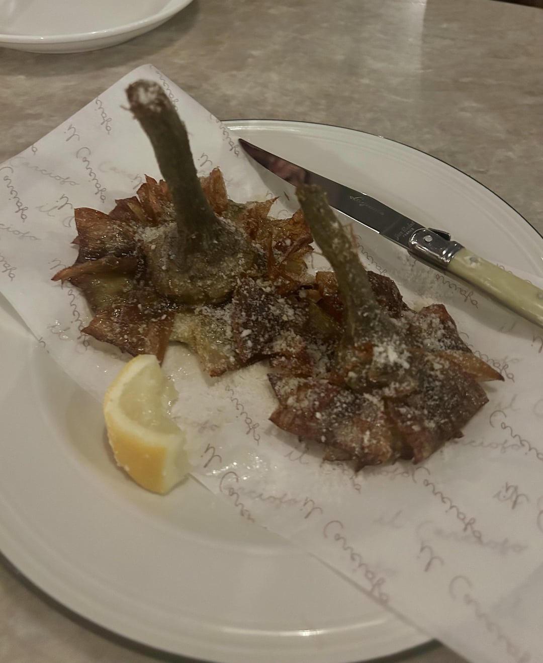 Carciofi all a Guida – Roman style artichokes, poached in oil. Great with the lemon squeezed all over them.