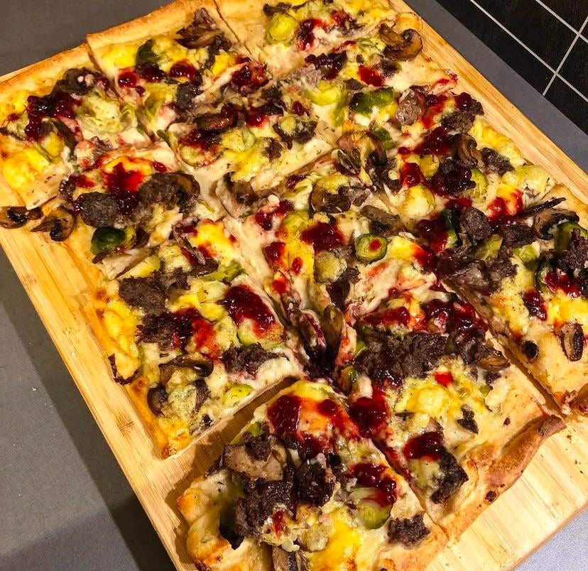 I plead innocence but some of my friends say this is a crime. Reindeer, mushroom, Brussel sprout, Jarlsberg cheese and tyttebær pizza.