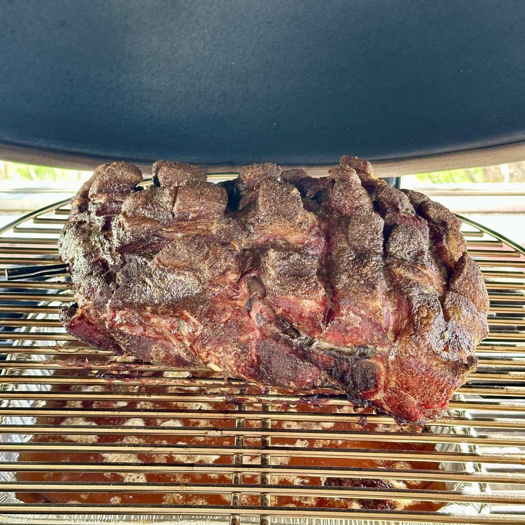 A spin on pernil. Low and slow, 225 F, until your internal temp is 160 F then raise your cook temp to 350 F until your internal temp reaches 195 F. Close your vents and let it rest. You should get a tender pork shoulder with crispy cracklin on the top and tender meat underneath.