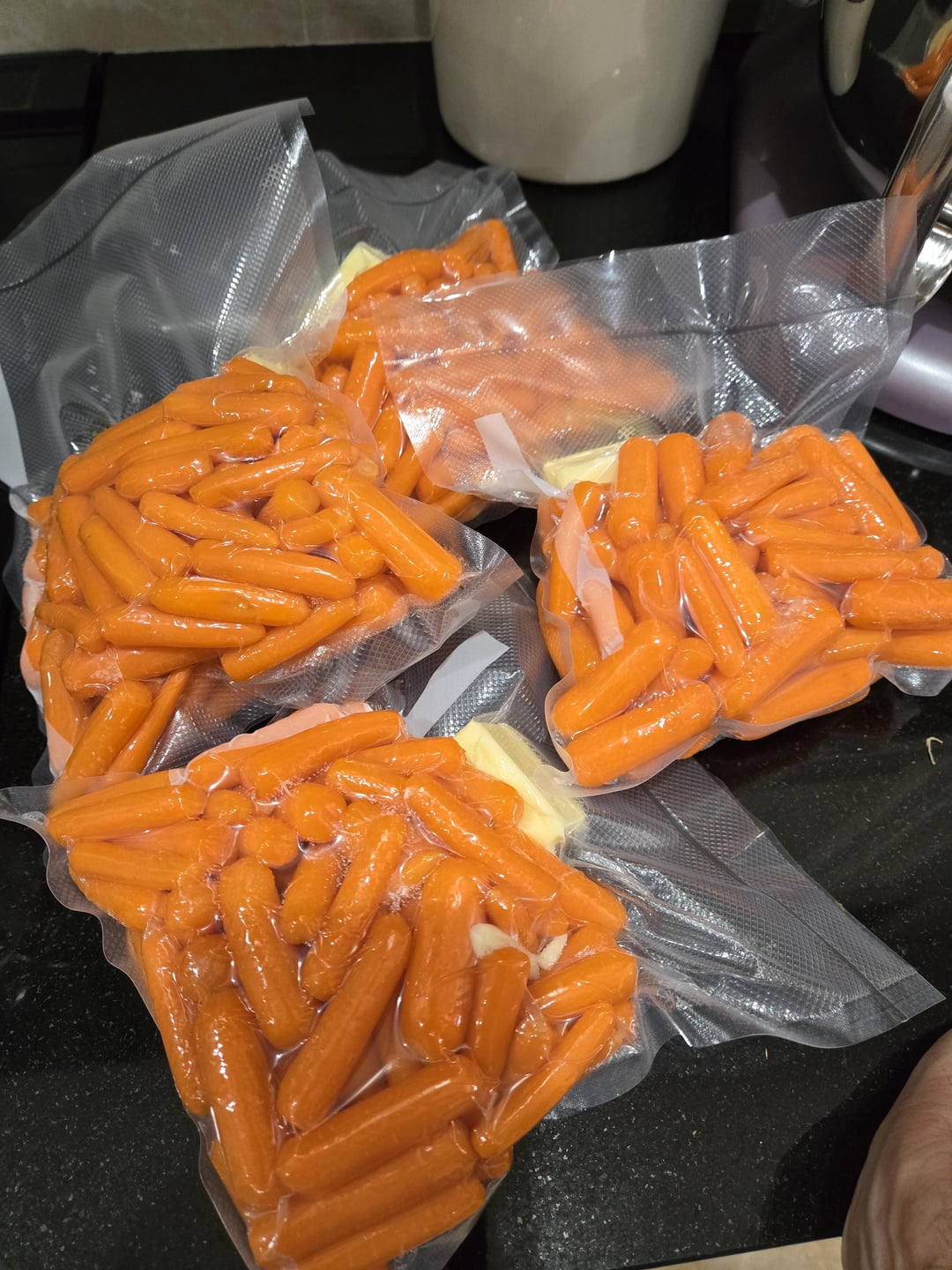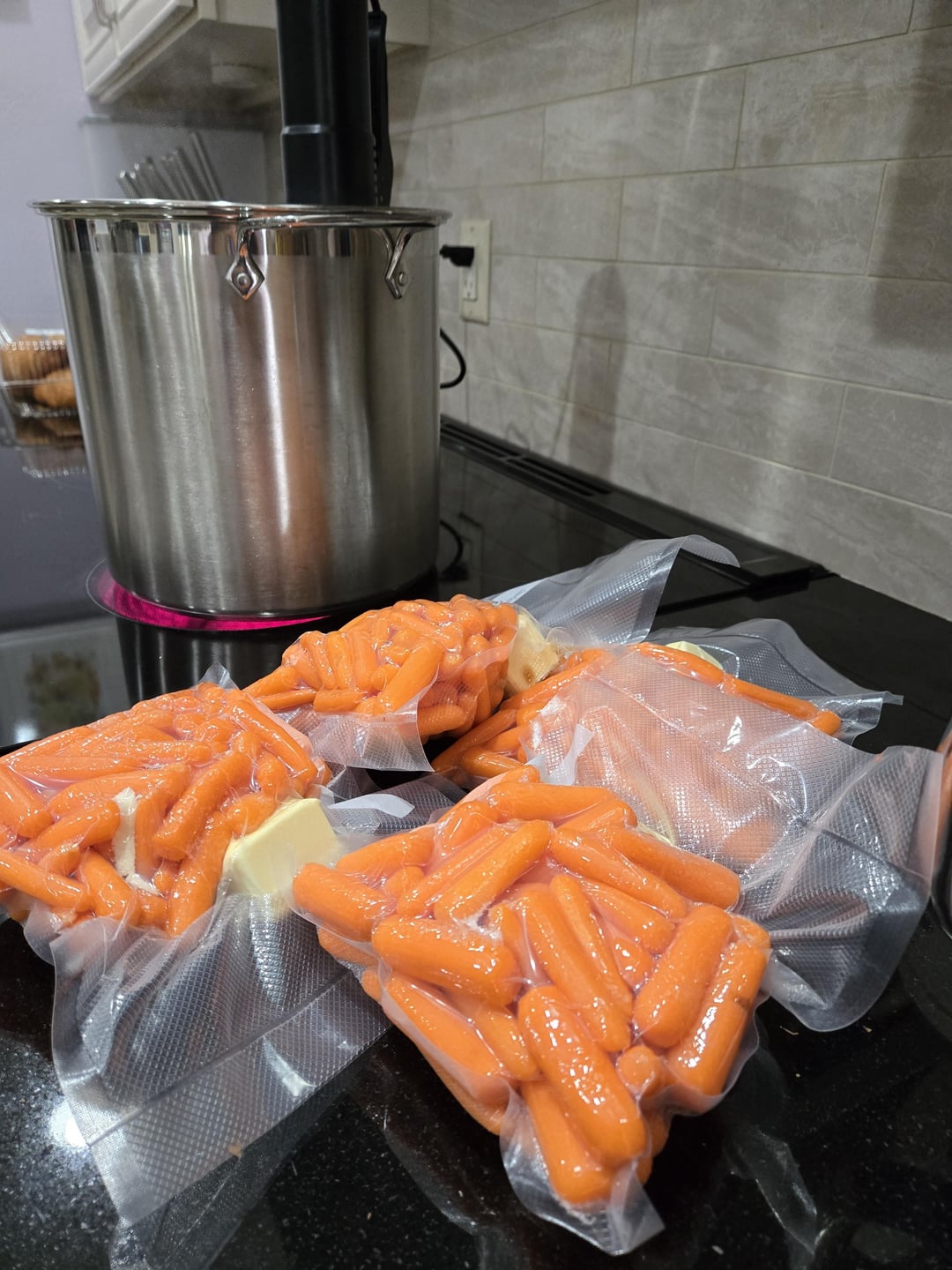 4lbs of baby carrots. 1/2lb in each bag, plus 1/2 tsp kosher salt, 1tsp white sugar, and 3 tbsp butter. 1 bag I subbed the white sugar for 2 tsp dark brown sugar and 2 tsp bourbon. 185 for 1hr 15 min, cool down and into the fridge and freezer for another day. Finish in ci/cs pan until liquids are reduced and carrots are glazed and have some color. The only way I will eat carrots anymore.