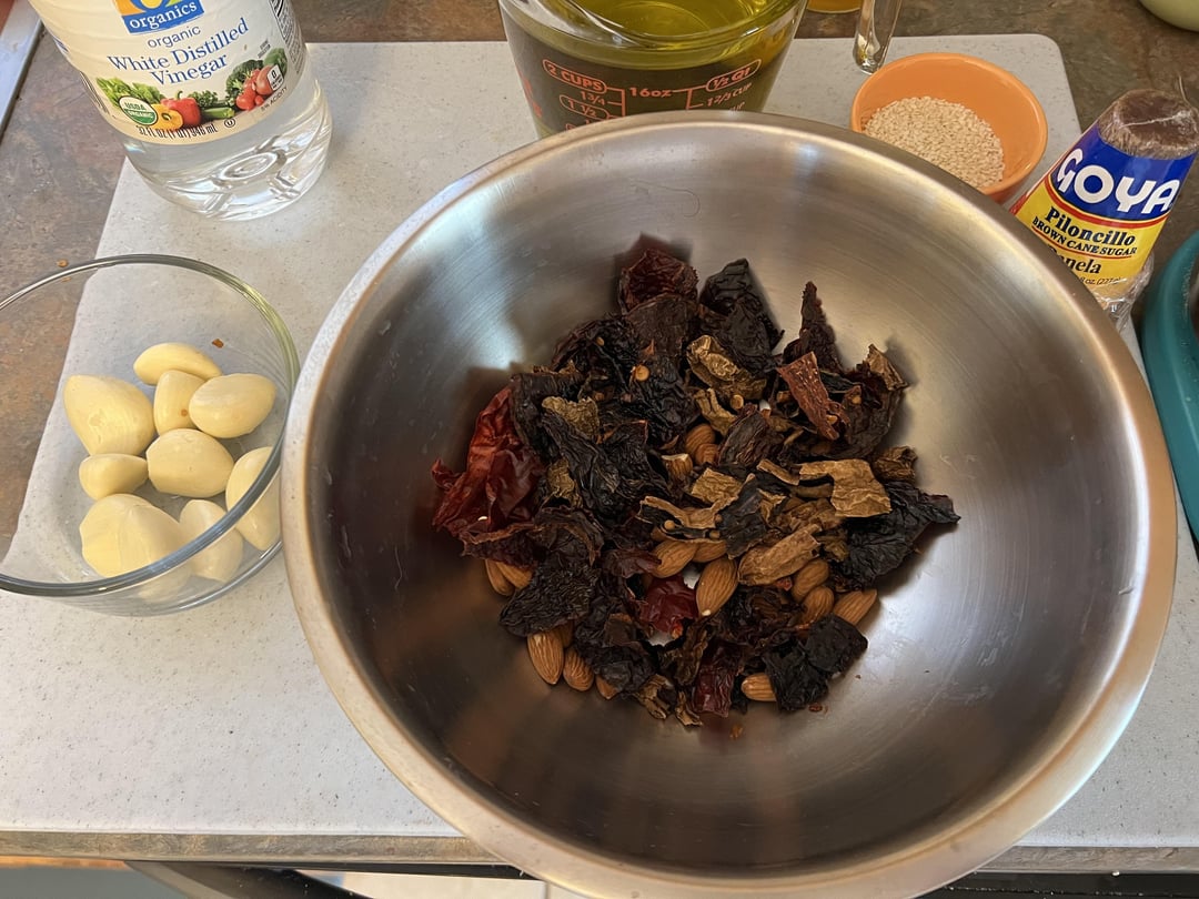 2-2.5 oz of stemmed and seeded dried chiles. 1.5 oz MUST be moritas, then I typically use chipotles and a small japone or árbol. In today’s batch I used chipotles, guajillo and ancho and ended up with 2.1 oz total. Gave me a medium-leaning heat level.