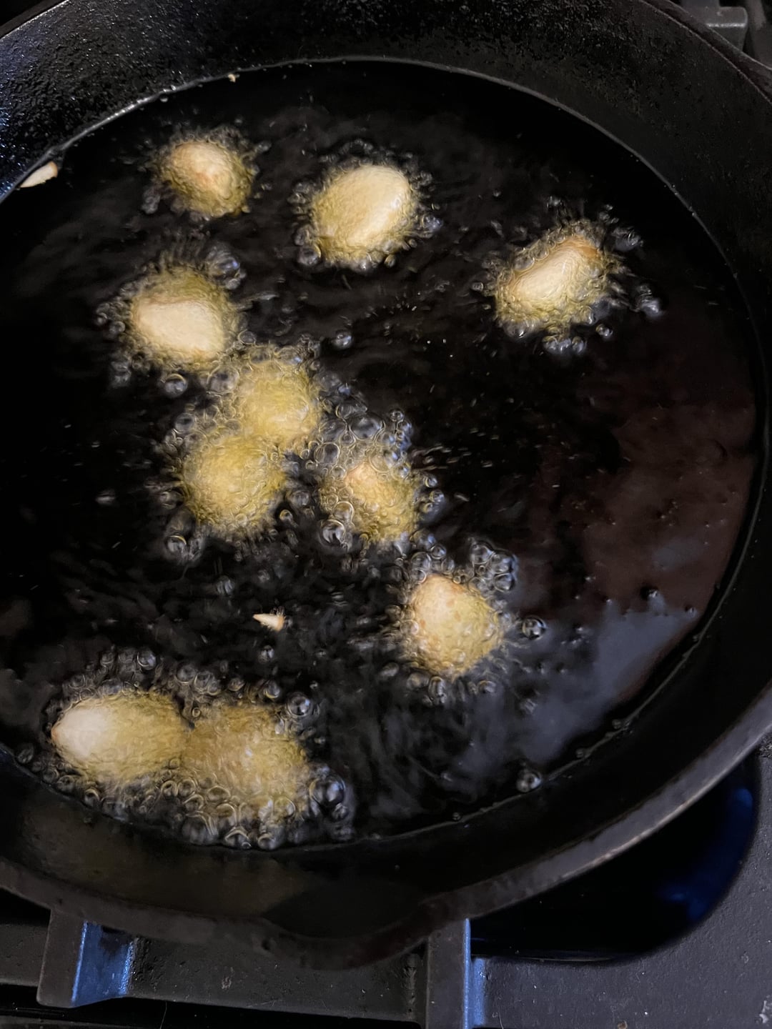 Add garlic cloves and stir, flip and fry until blistered and browned (see pic) about 1-2 minutes.