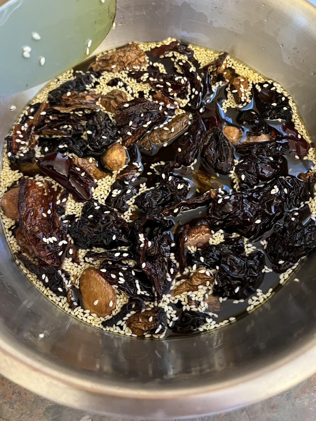 Quickly add the sesame seeds so they lightly fry but don’t burn. I used to leave it in the pan, but now I put the sesame seeds in a heatproof bowl and pour the hot oil and chiles over them.