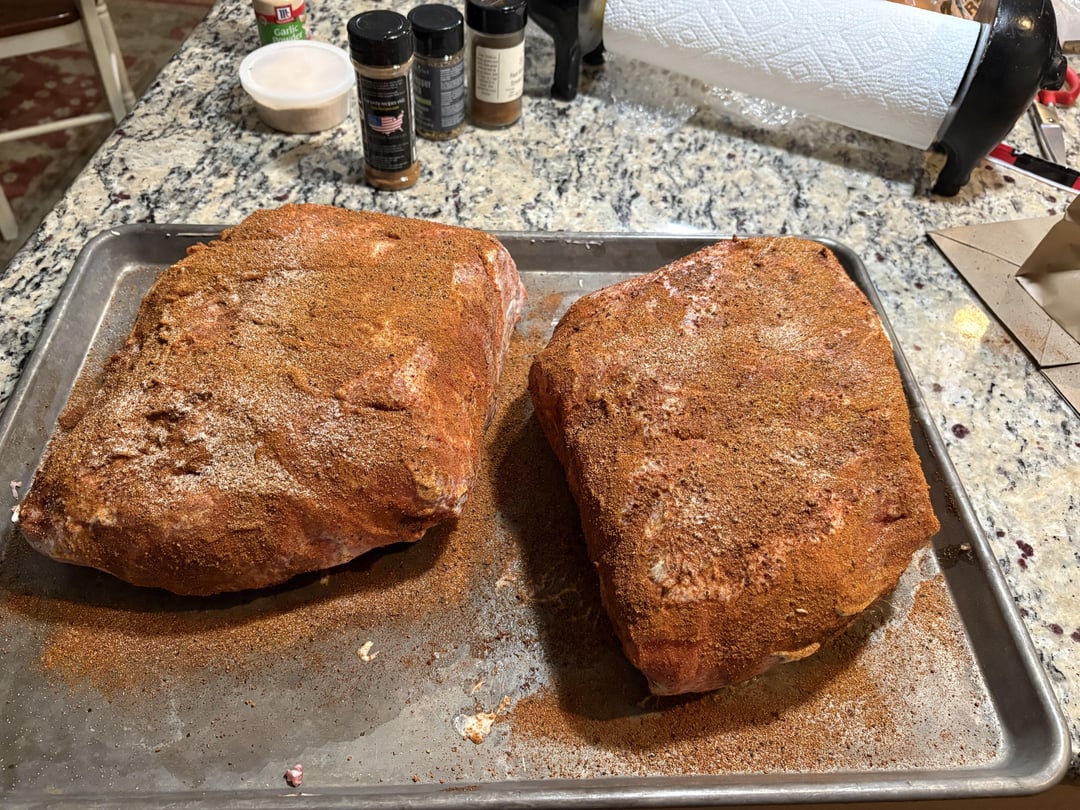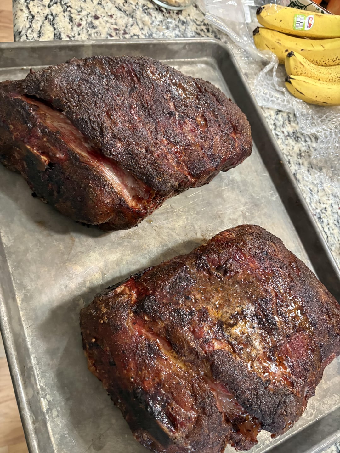 I did two 12 pound bone in pork shoulders, 225 for 9 hours till the stall at 160. Wrapped in butcher paper and cooked for another 6 plus hours at 250 till the temperature passed 200 and it was probe tender. Let it rest for an hour wrapped. I seasoned with smoky Mountain rub, DAX no salt rub, and garlic powder.