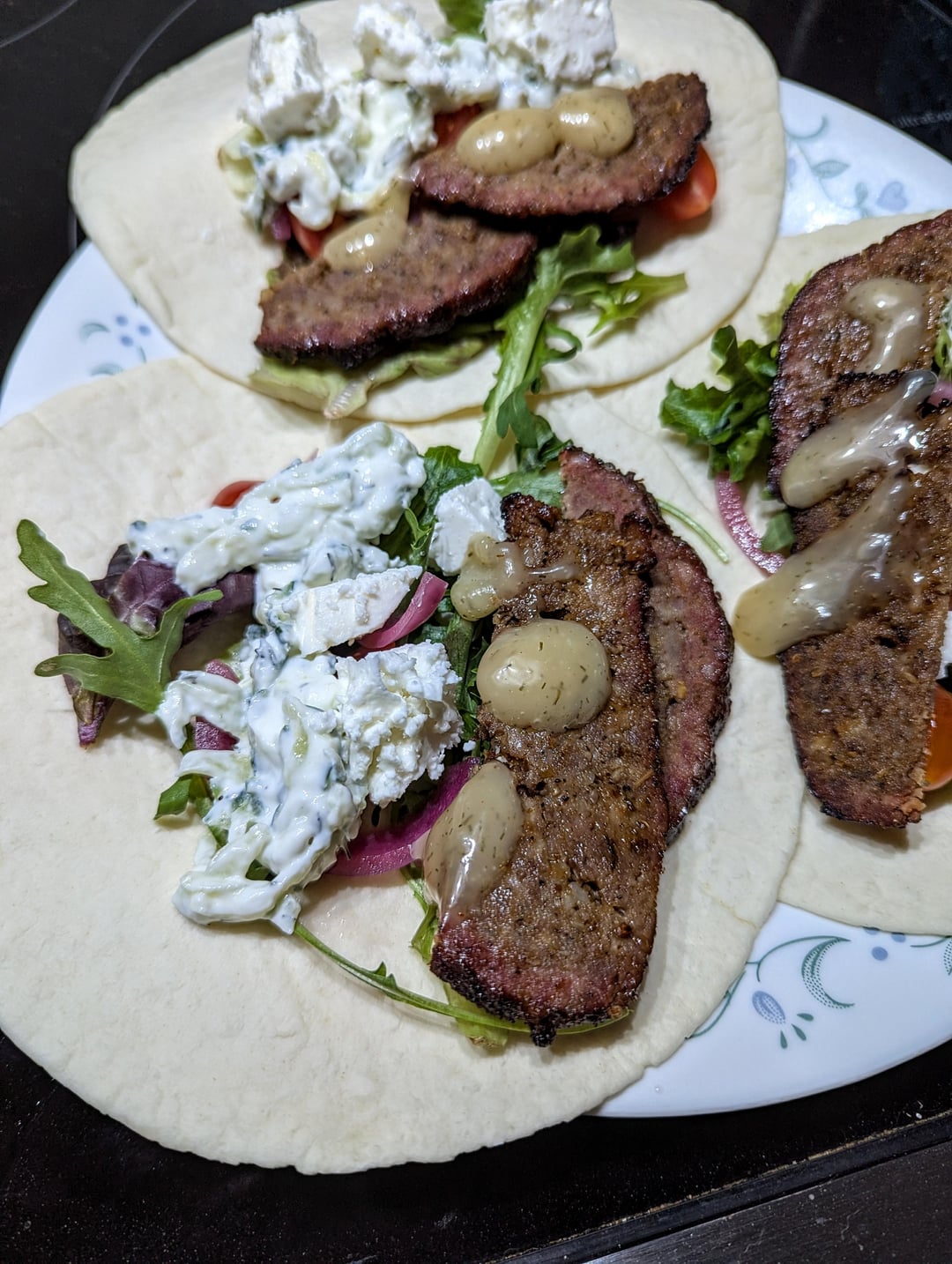 Smoked up some Donair today. After the smoke, thinly sliced and seared, paired with tzatziki, feta, tomatoes, pickled onion, spring mix, and a honey-dill sauce.