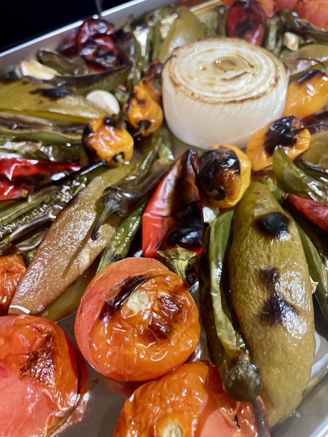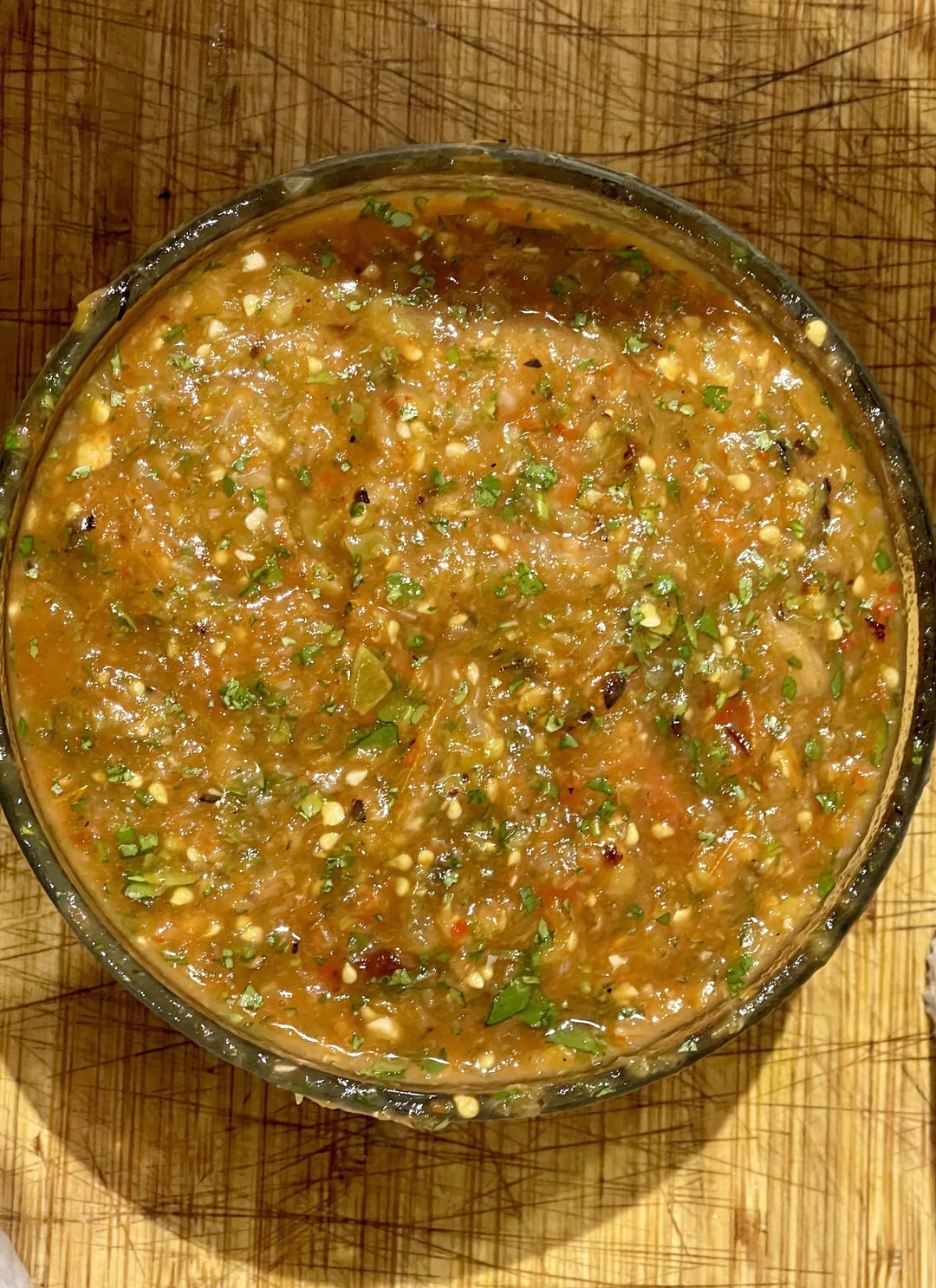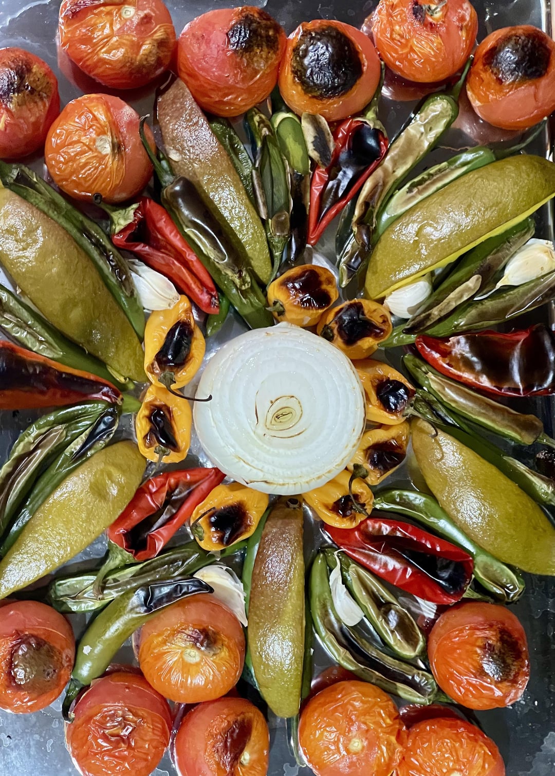 This one is spicy 1 mango. Inspired by recent posts 12 Roma tomatoes 20 Serrano chilis 8 Habenero 6 Fresno chilis 6 cloves garlic 2 limes squeezed Cilantro handful Cumin salt and pepper to taste I roasted one side 10 min and flipped to Roast the other side Tastes delicious but still chillin In fridge Enjoy