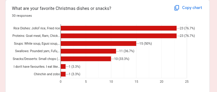 Rice dishes and meat tied at 23 votes each. This, I expect, surprises no one. Popular knowledge holds that 70% of the Nigerian human body is rice. The other 30% is erudite insults under 280 characters.