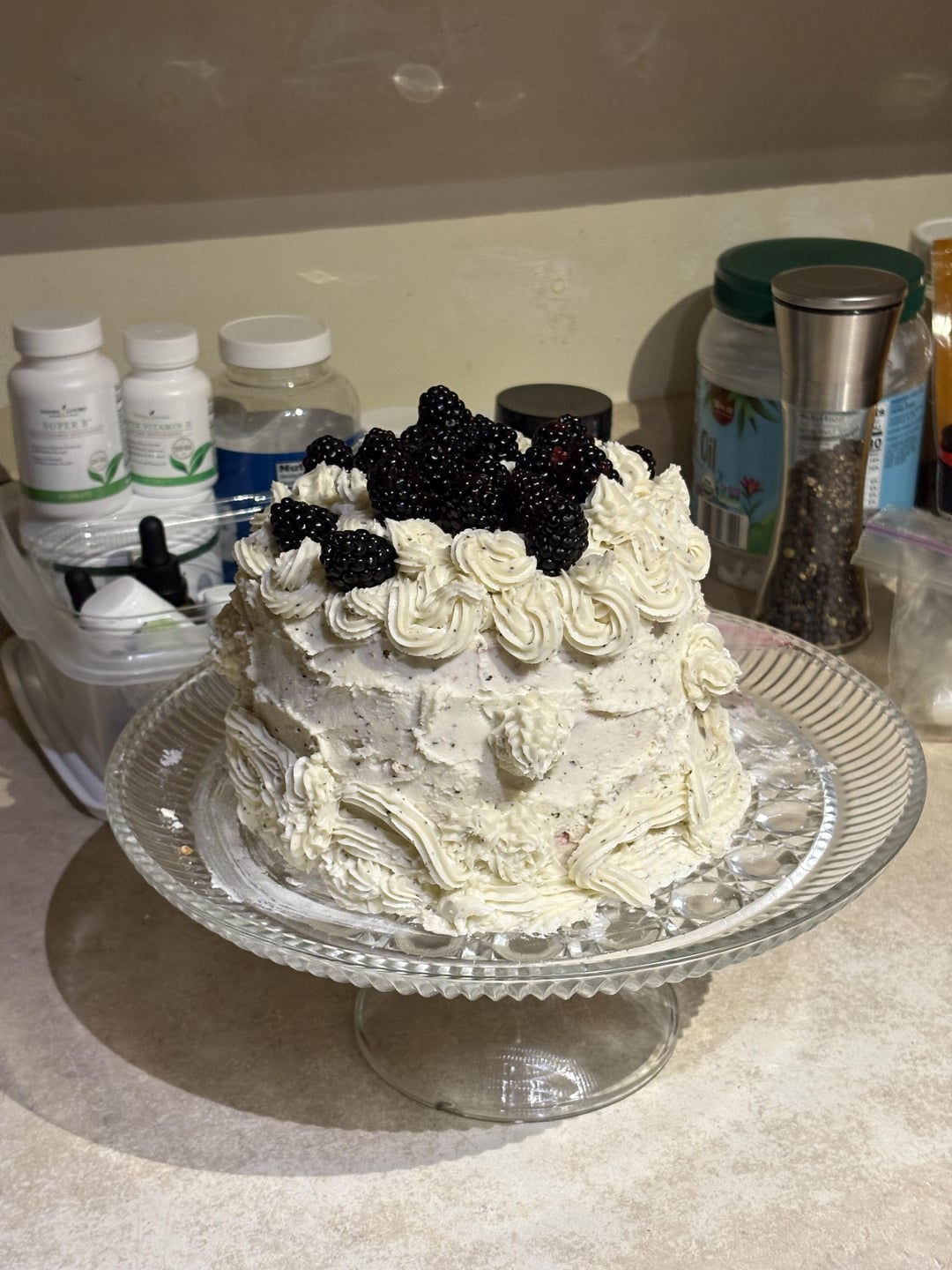 first pic was the first two layers. there is a blackberry coulis in the center of each layer that i struggled with keeping in place as i added the crumb layer. said screw it and just did whatever after i messed up at the start lol. would love some advice fore future cakes i make so i don't have such a ugly cake
