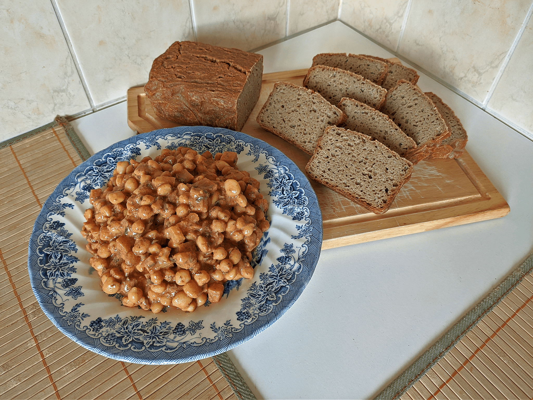 Both the stew and the bread were well done, enjoyed by all who tasted it, and I think they were tasty too. On the point of fermentation, I like to lacto-ferment cooking ingredients – or even most of them – as fermentation can significantly enrich the flavour and also aid the absorption of nutrients. Of course, you can also simply make the recipe with soaked legumes and the dish will be very tasty. Plus, chicheria is little known in many places, but it is a super legume. If not available, feel free to use other legumes or even just chickpeas.