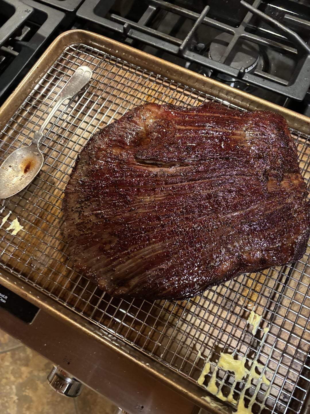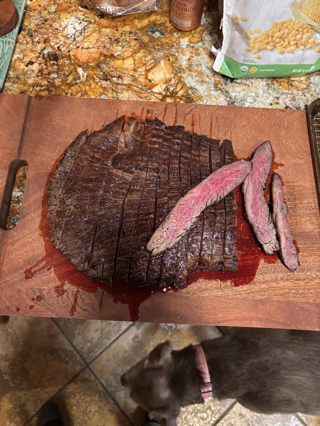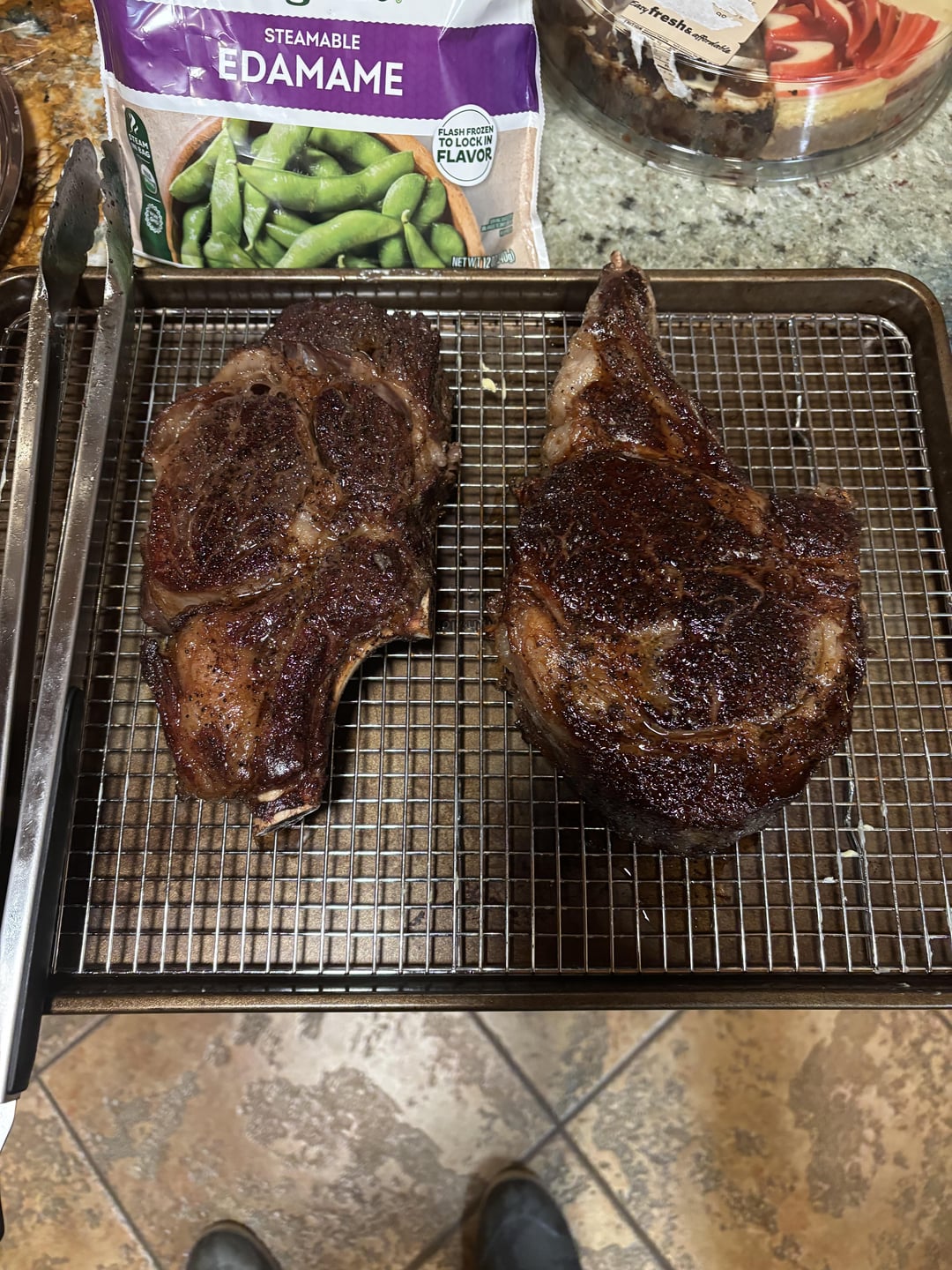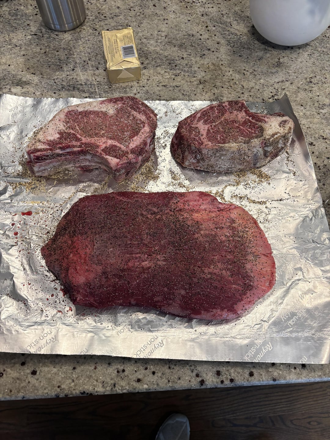Did some steaks for the family for new years. Wagyu flank steak, and two dry aged prime bone in ribeyes about 2.5" thick. Flank done at 129, ribeyes at 137. Finished in a cast iron skillet with duck fat then topped with homemade truffle butter.