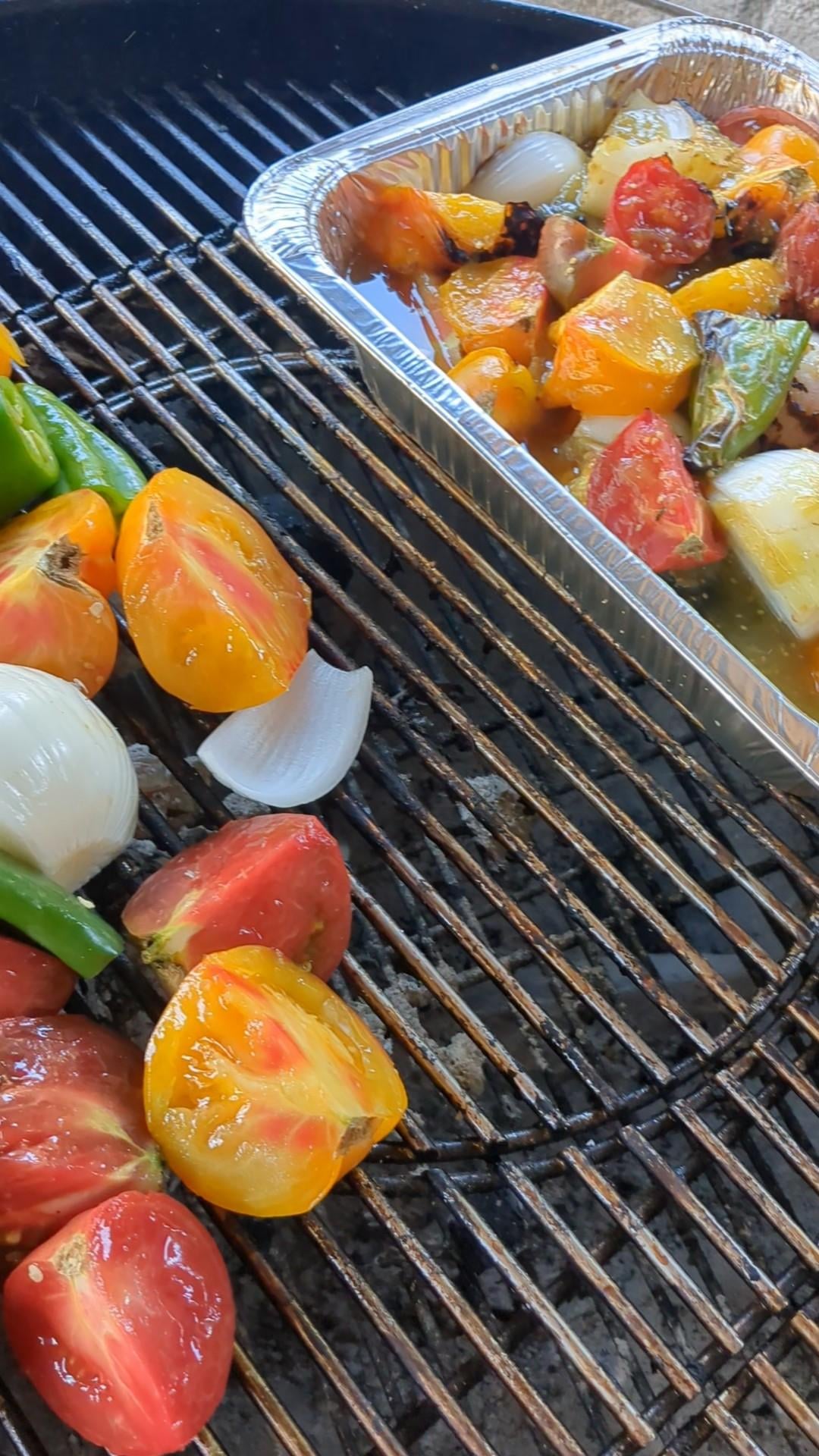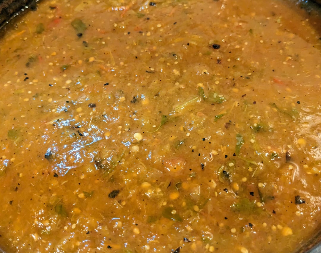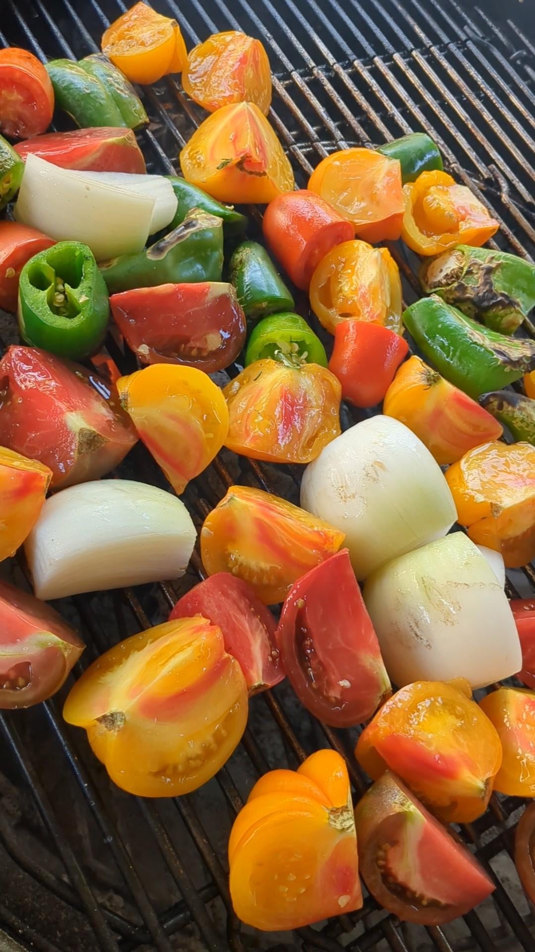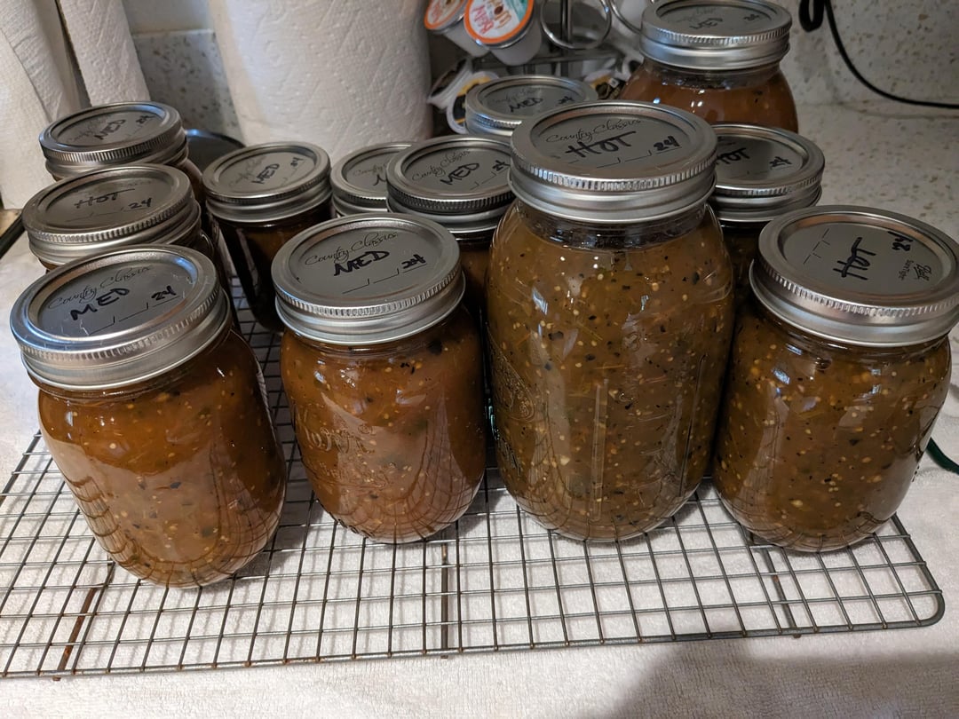 I did not grow any tomatoes or peppers this season. A bunch of heirlooms, a few romas, jalapenos, hatch chilis, serranos and white onion. Fire roast them for some char then transfer to pans to smoke with hickory and mesquite for at least an hour. Blend up roasted veggies with canned crushed tomatillos, canned fire roasted tomatoes and fresh cilantro then simmer for a few hours. Add some fine diced onion and cilantro for texture. I usually make one pan spicier so I can add to either for desired taste. Let it rest then water bath can.