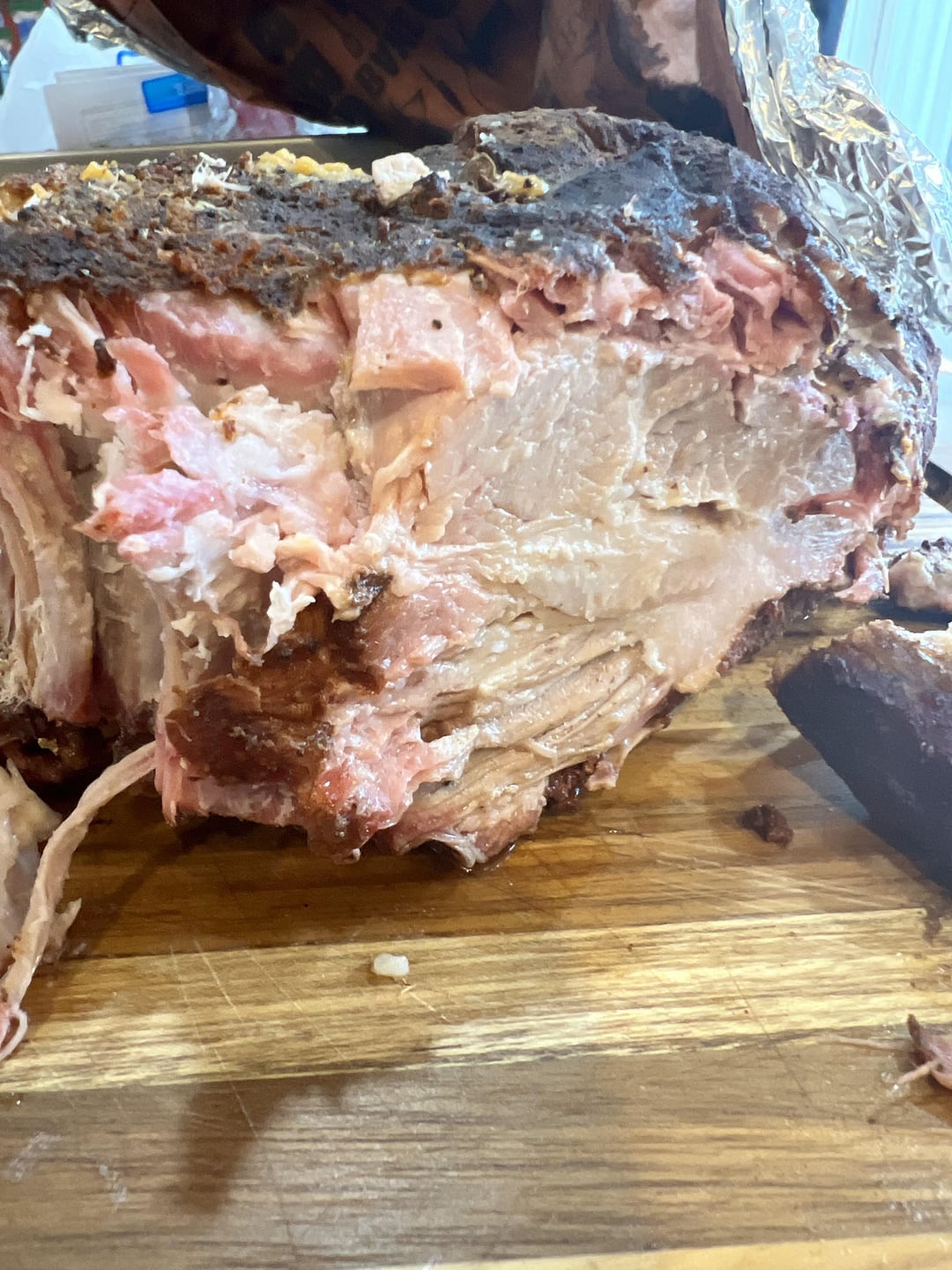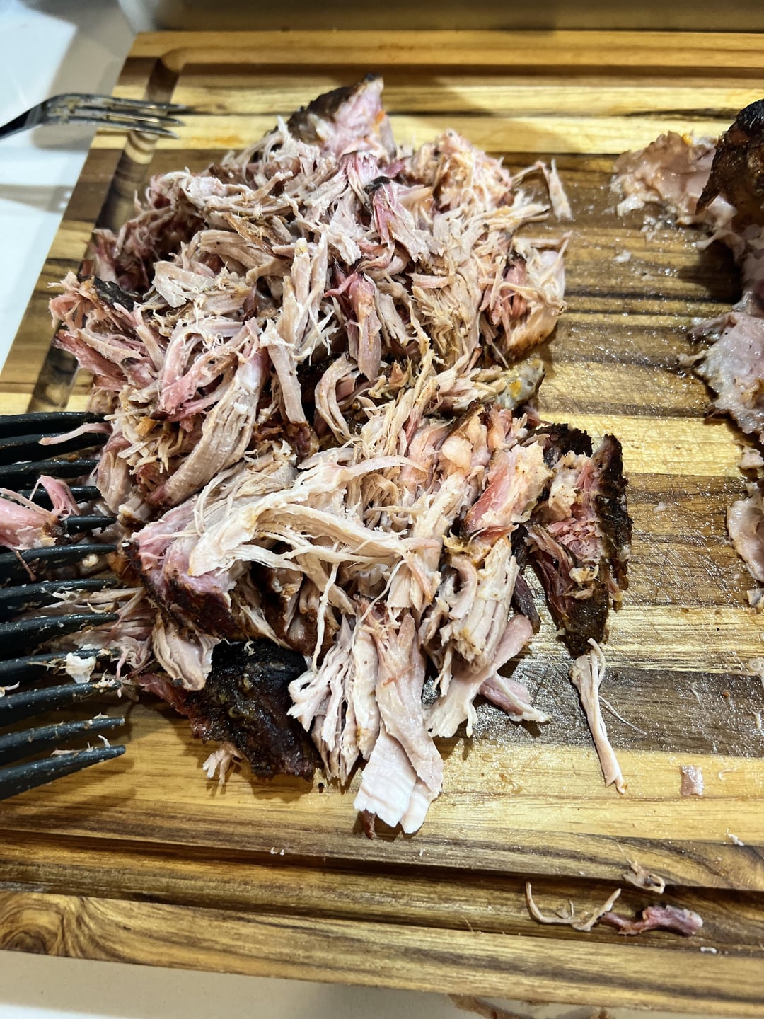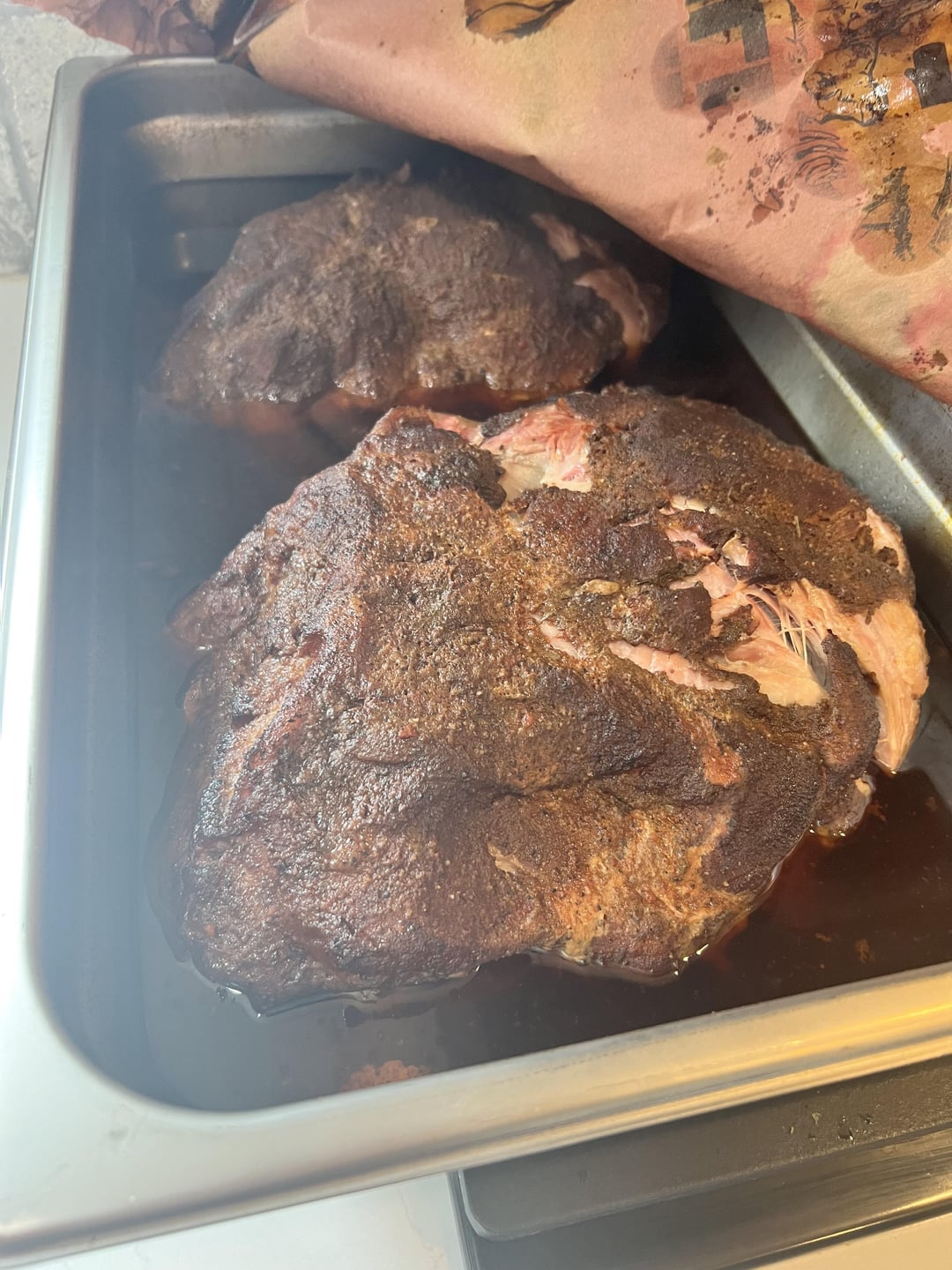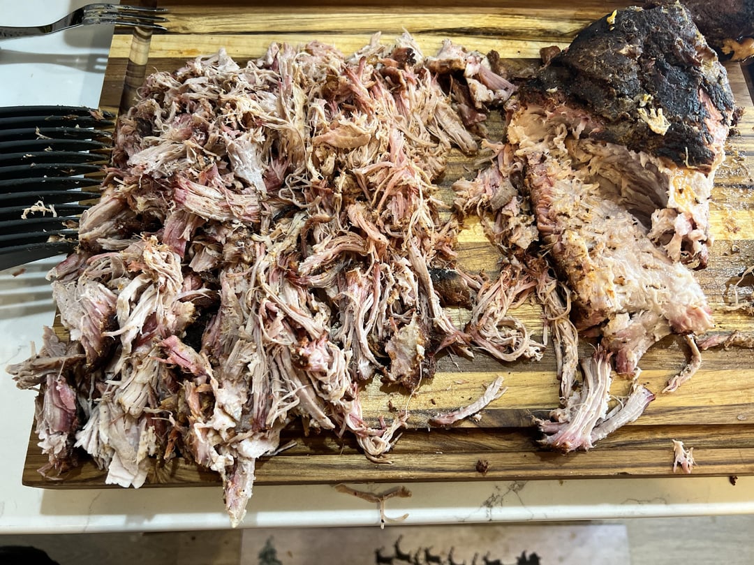 Pulled pork on my Traeger 1300 timberline super smoke for six hours and finished off in my dbl oven and Traeger within the steamer trays.