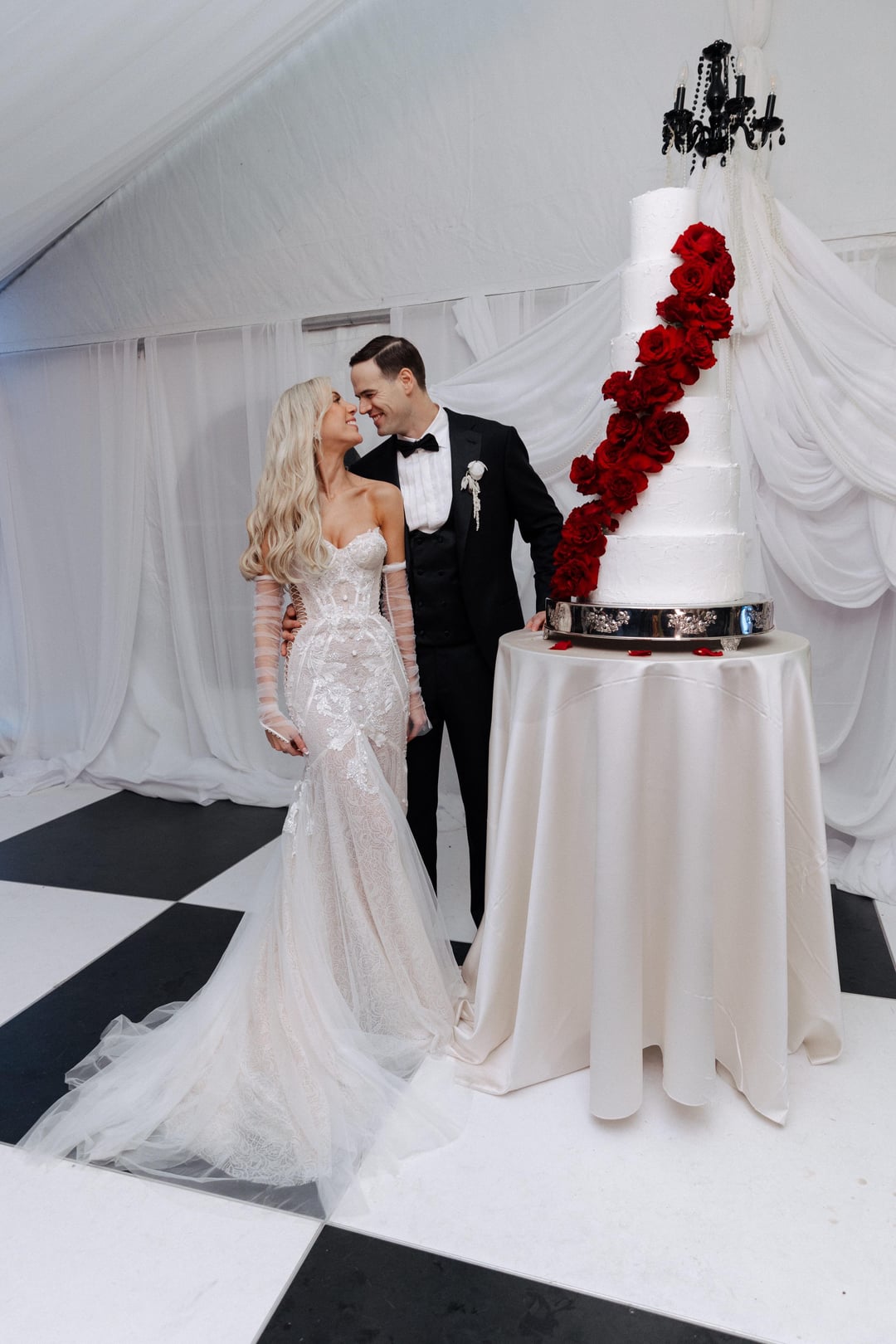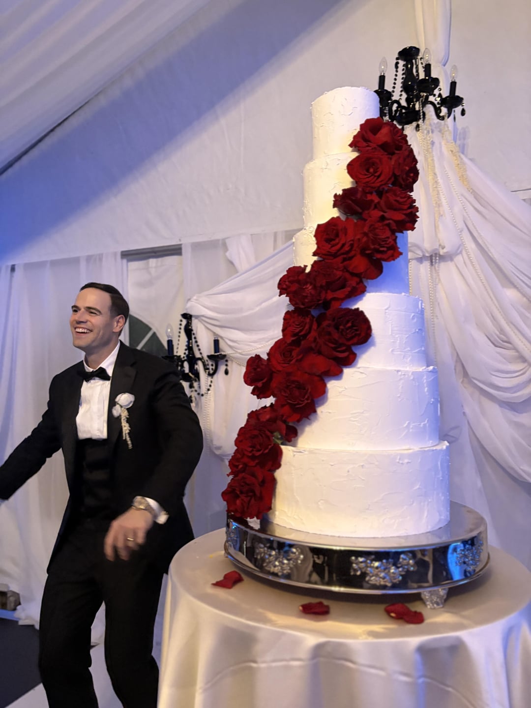 Oh my goodness, those deep red roses on top of that huge snow-white cake is just beautiful!