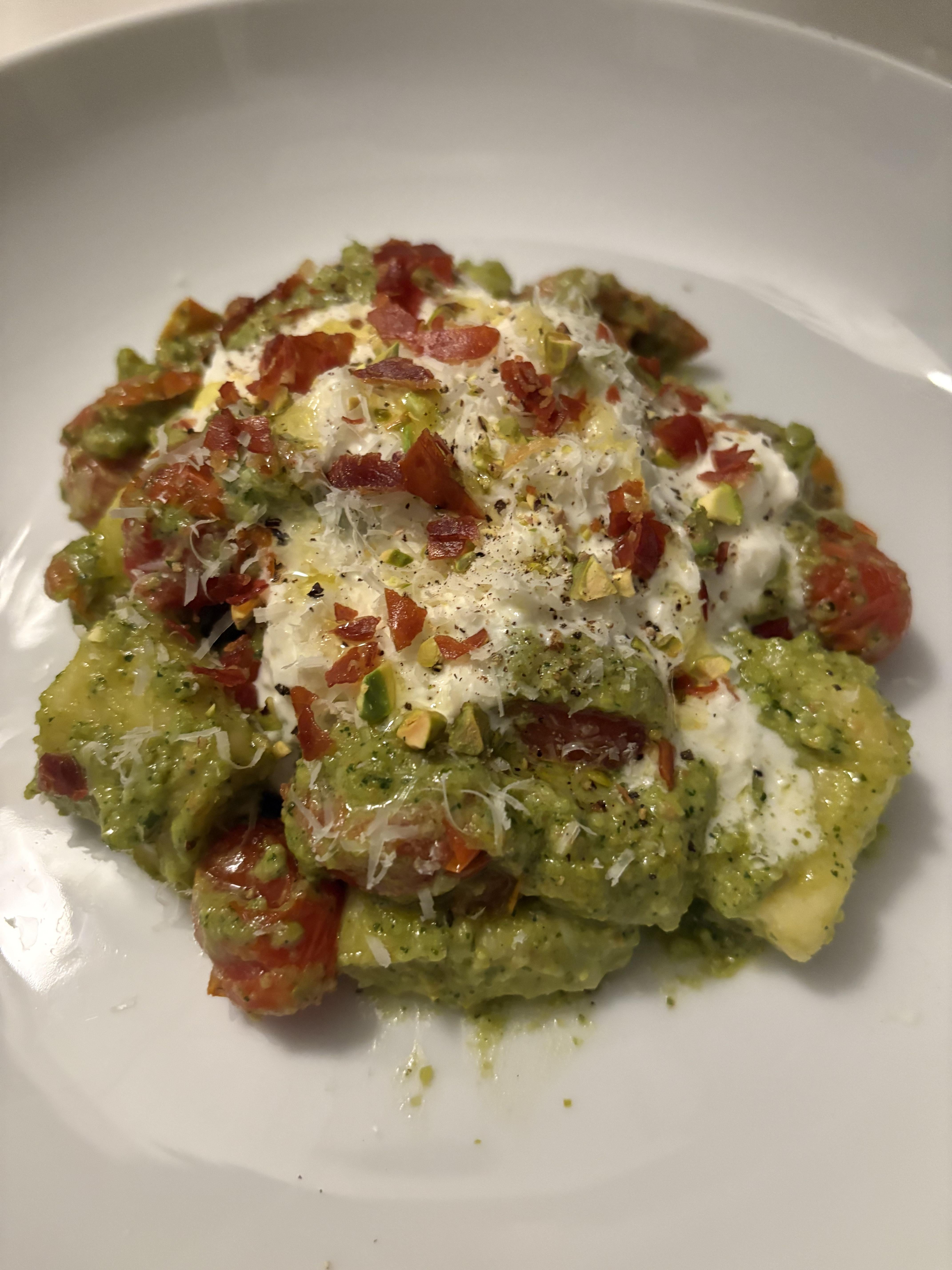 Ricotta gnocchi with pistachio pesto, straciatella roasted tomatoes and crispy prosciuttoby yytvavdj Write A CommentYou must be logged in to post a comment.